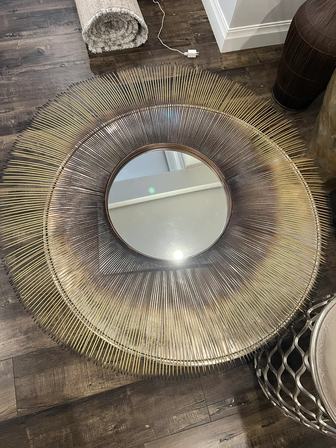 A striking sunburst wall mirror with a metal frame. It's designed to add a statement piece to any room. This mirror would be lovely in a living room or entryway.