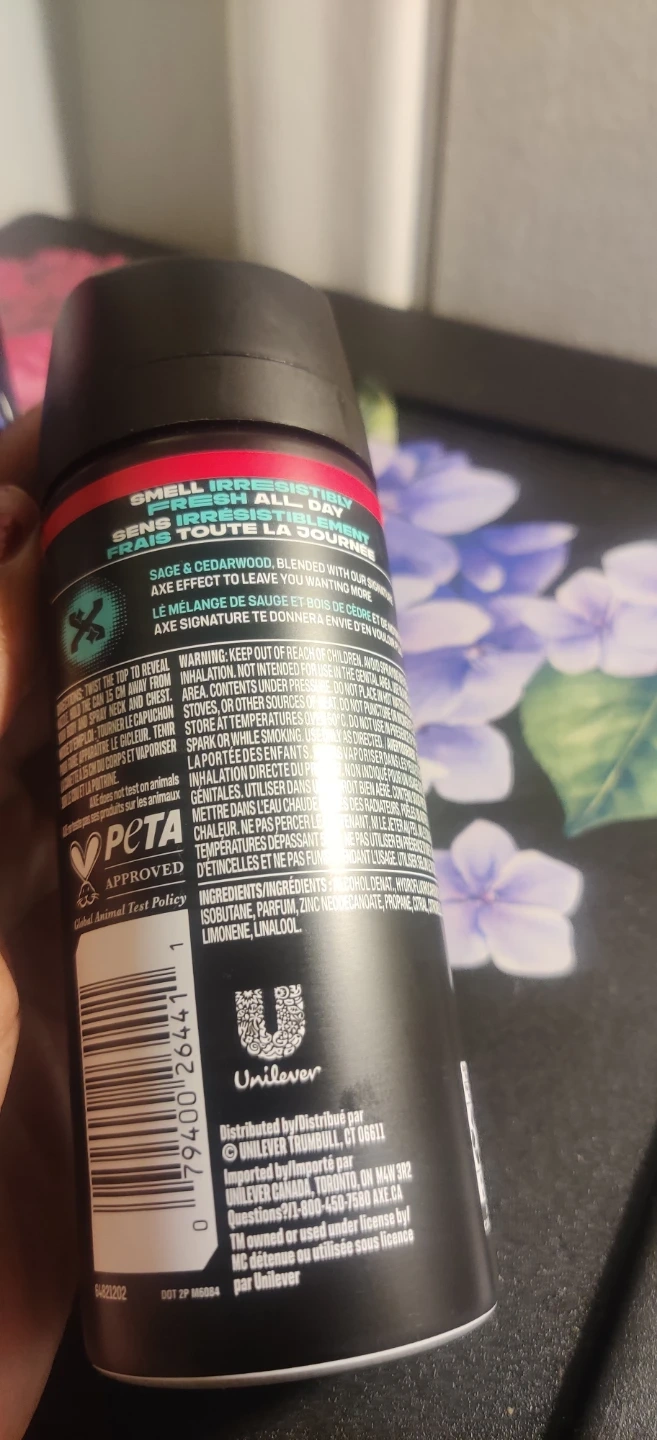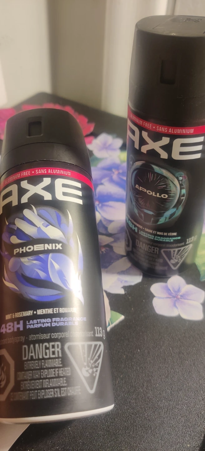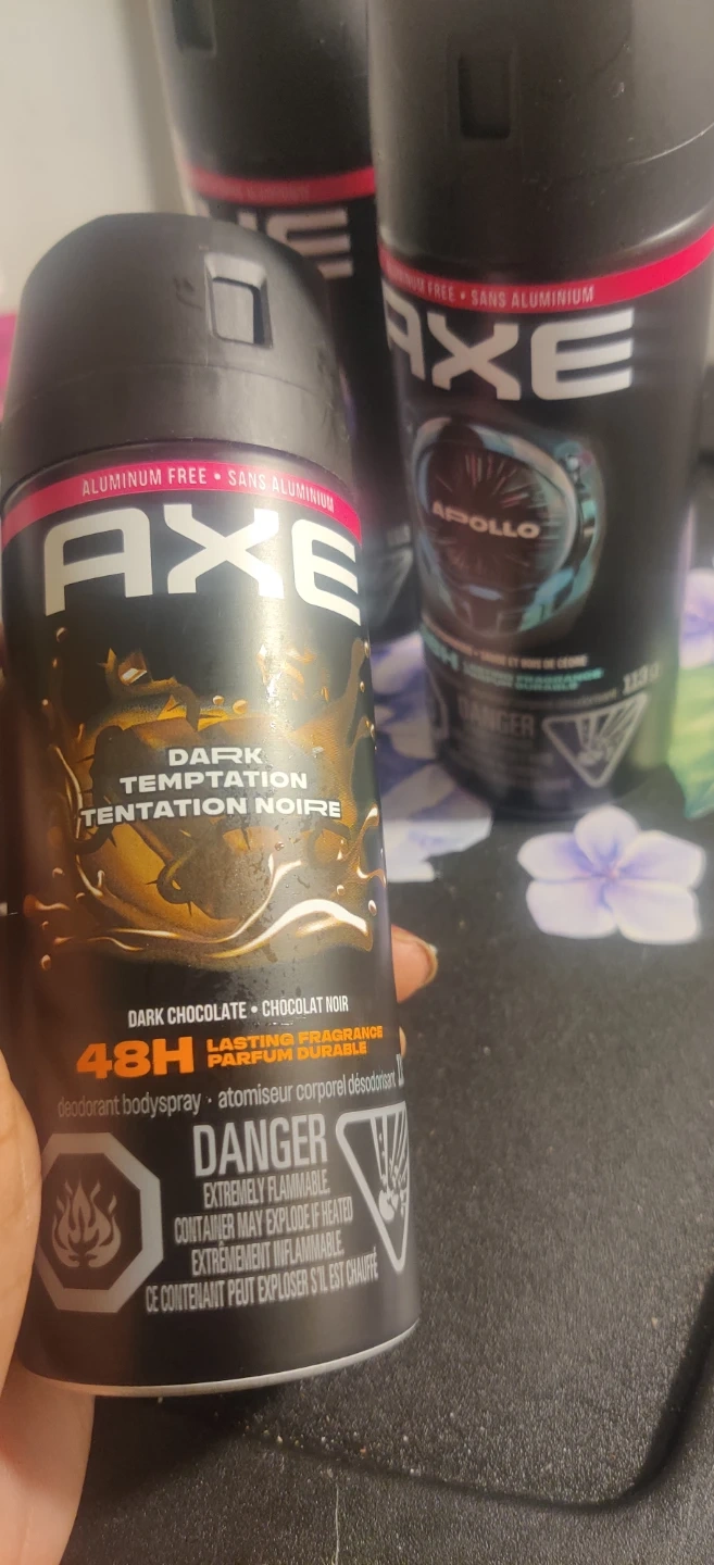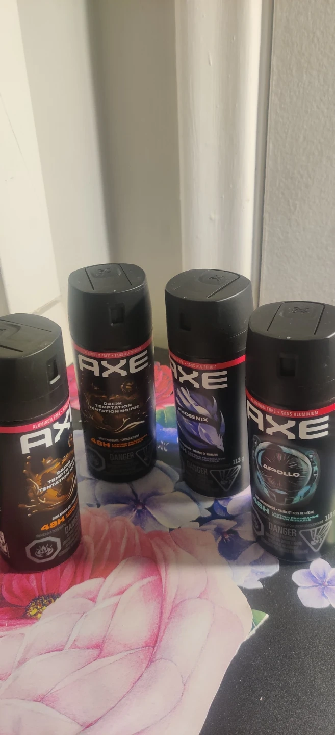 4 cans of Axe deodorant body spray are available. Scents include Dark Temptation, Apollo, and Phoenix. Each can is 113g and offers 48-hour lasting fragrance. These are aluminum-free deodorants.