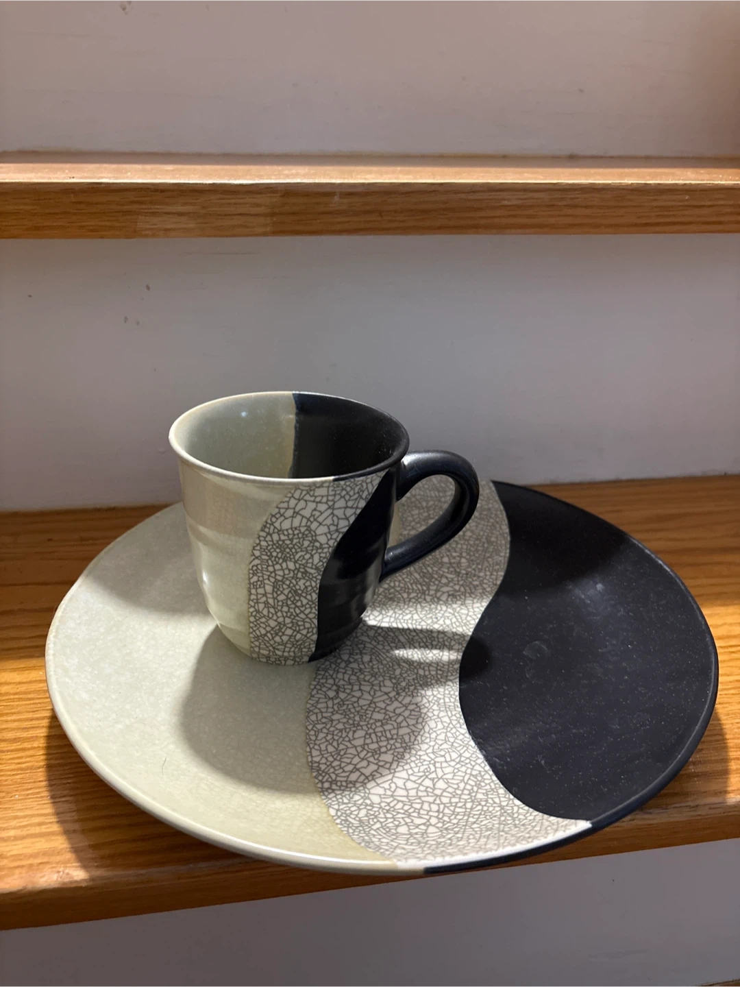 A Sango Dunes plate and mug set in a cool three-tone design. Both pieces are dishwasher and microwave safe. It's a nice set for your morning coffee and toast!