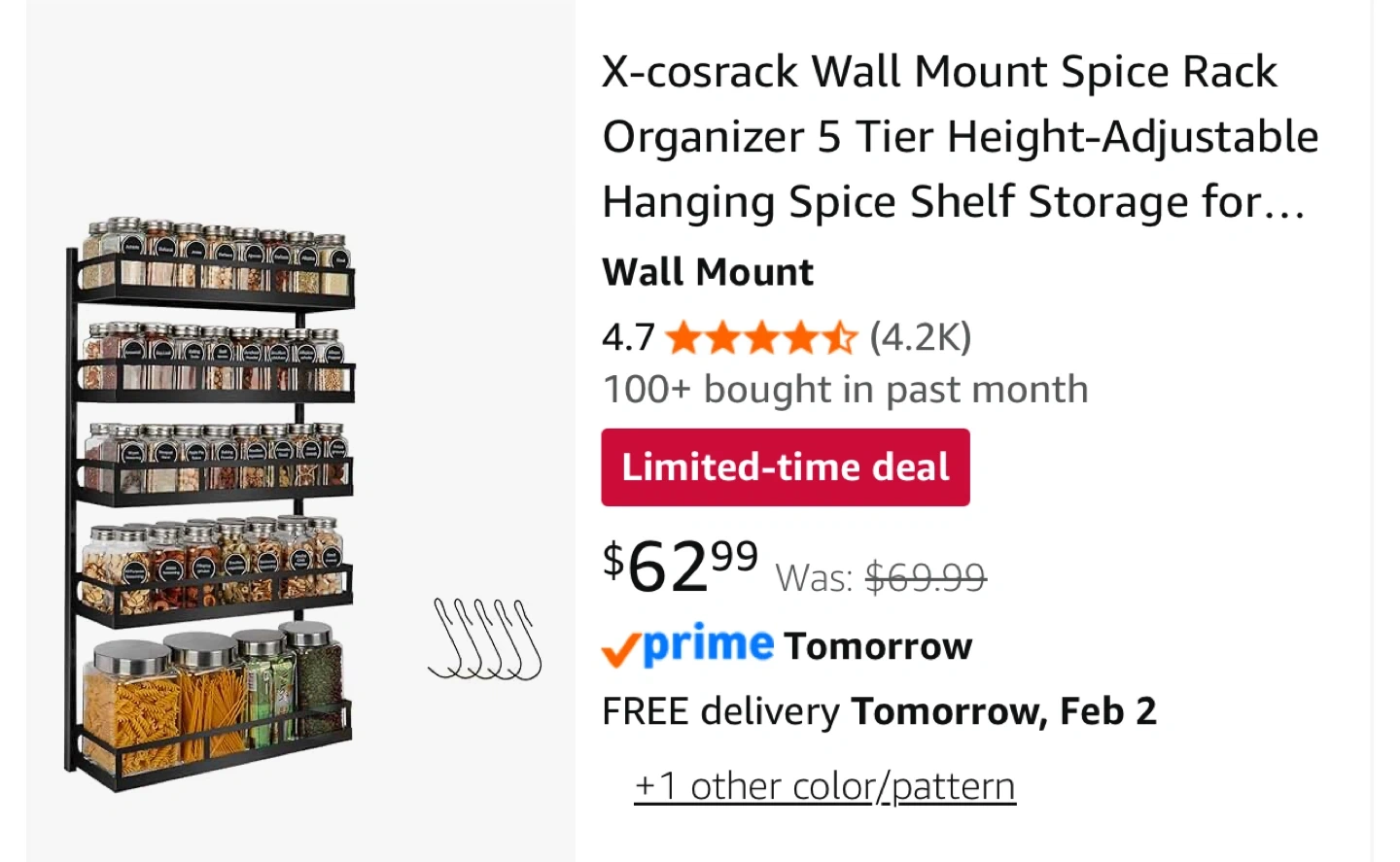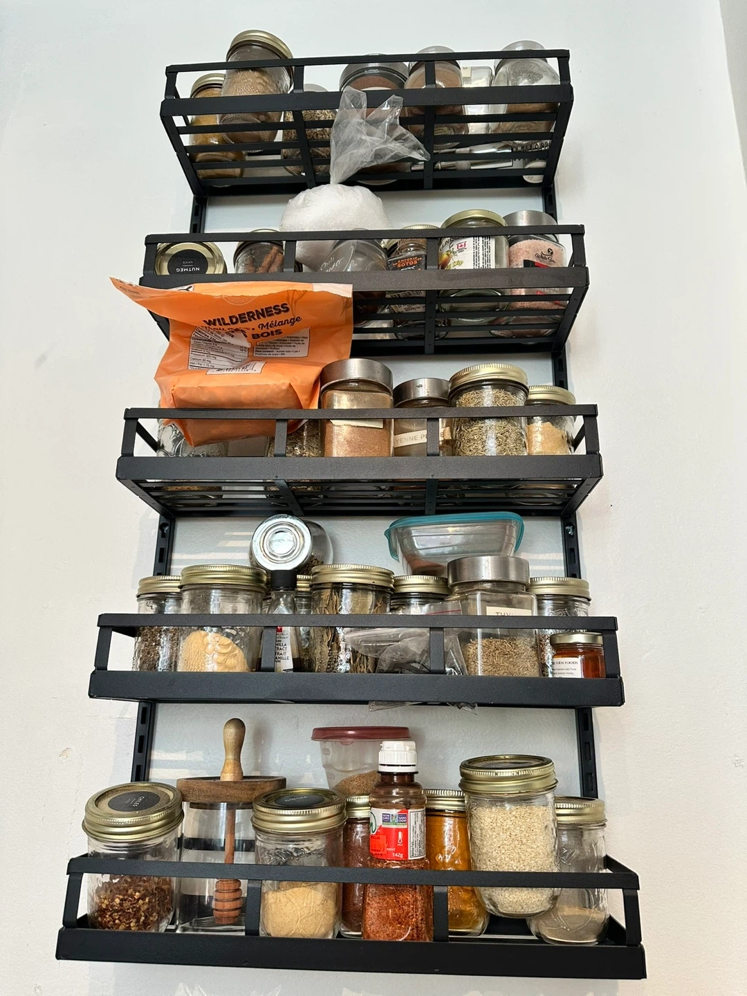 This X-cosrack spice rack offers 5 tiers of adjustable storage for your kitchen. It's designed for wall mounting to save counter space. The sturdy metal construction holds numerous spice jars securely.