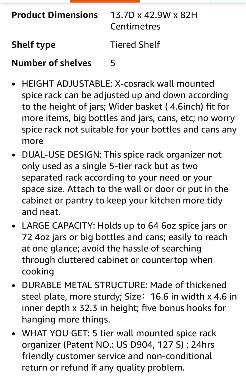 X-cosrack Wall Mount Spice Rack Organizer - 5 Tier