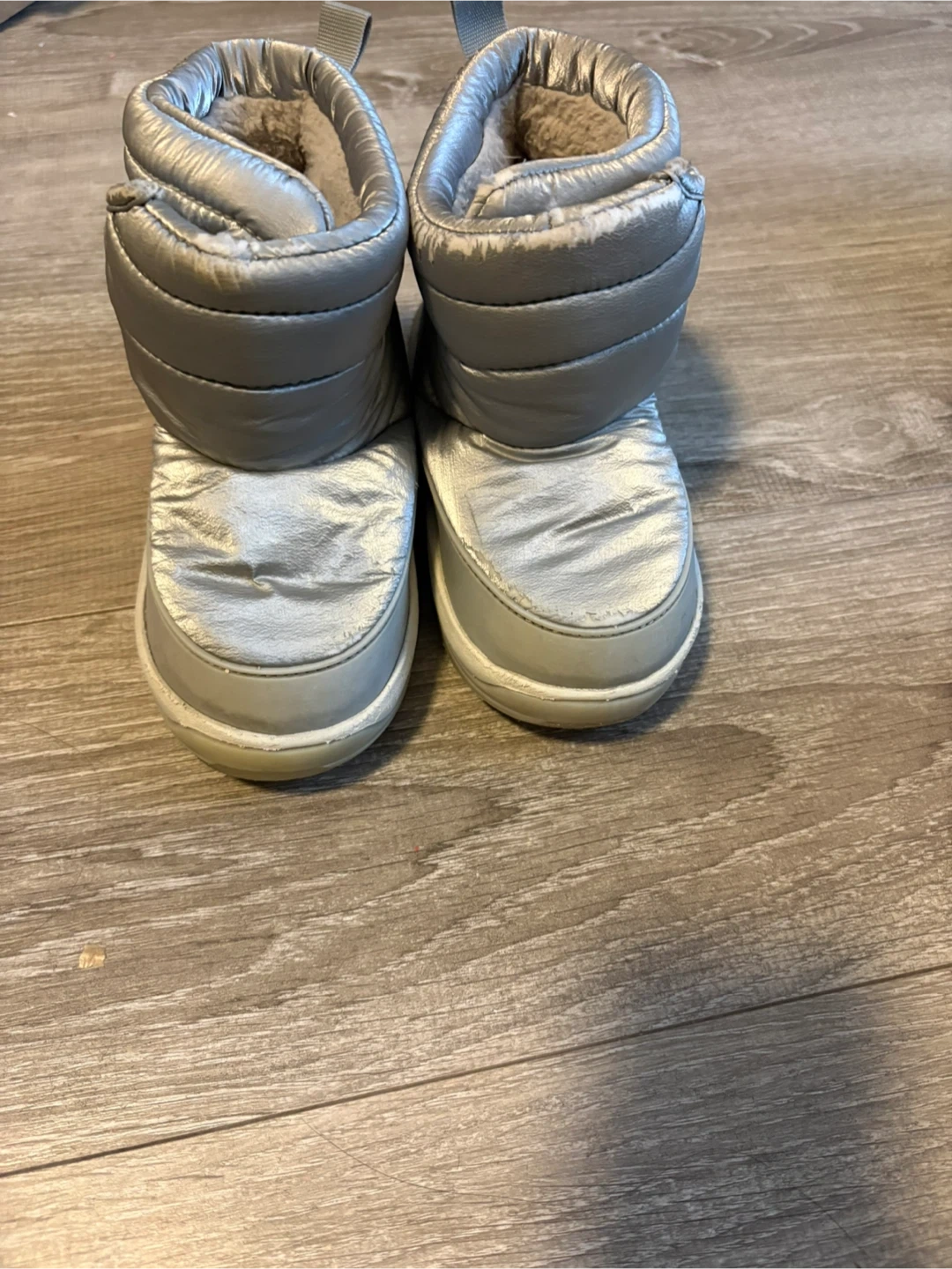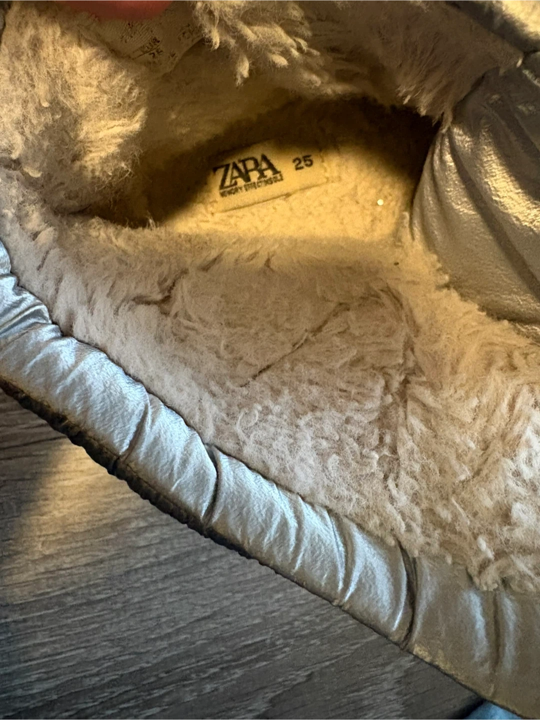 These Zara kids winter boots are a shiny silver colour. They're lined with faux fur for warmth and have a puffer-style outer. Perfect for keeping little feet toasty during snowy days!