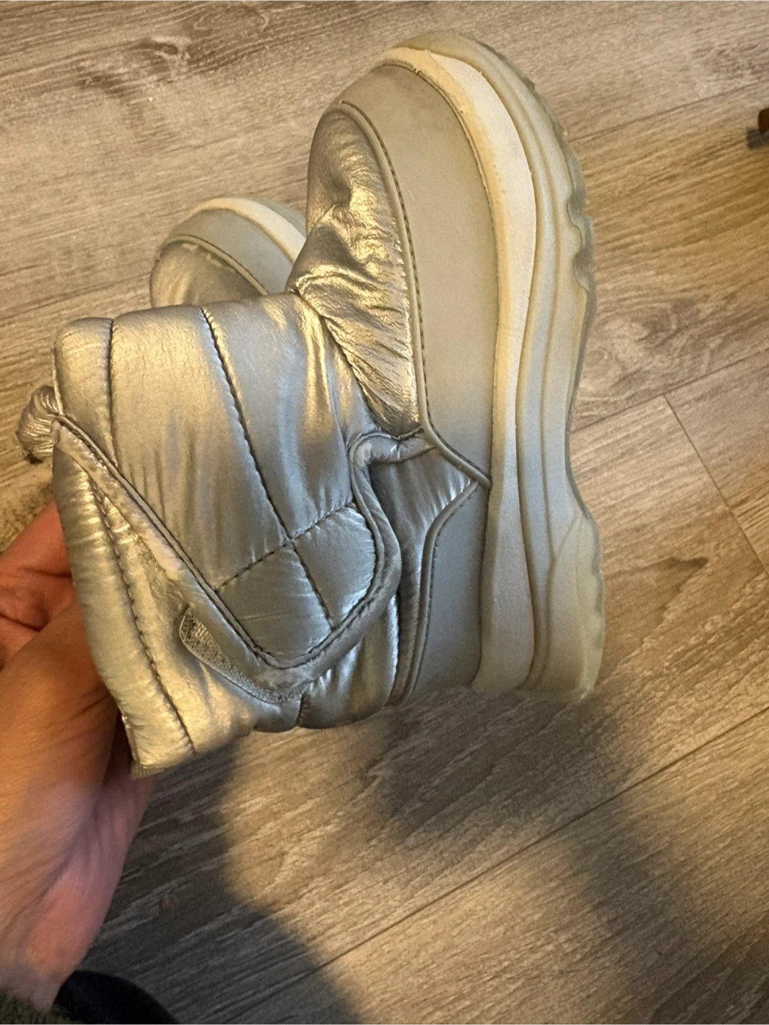 These Zara kids winter boots are a shiny silver colour. They're lined with faux fur for warmth and have a puffer-style outer. Perfect for keeping little feet toasty during snowy days!