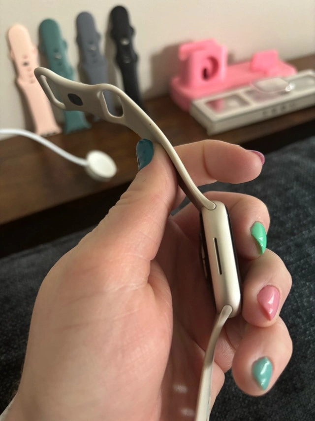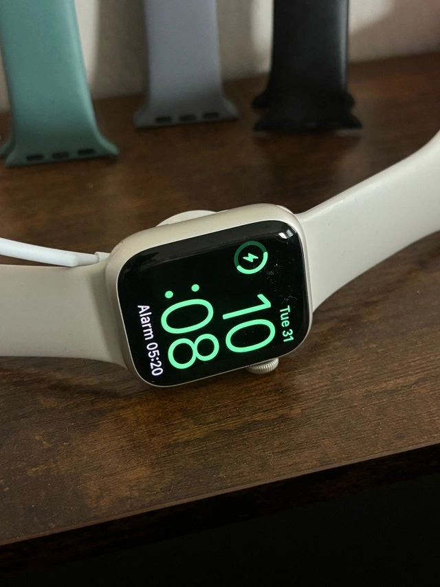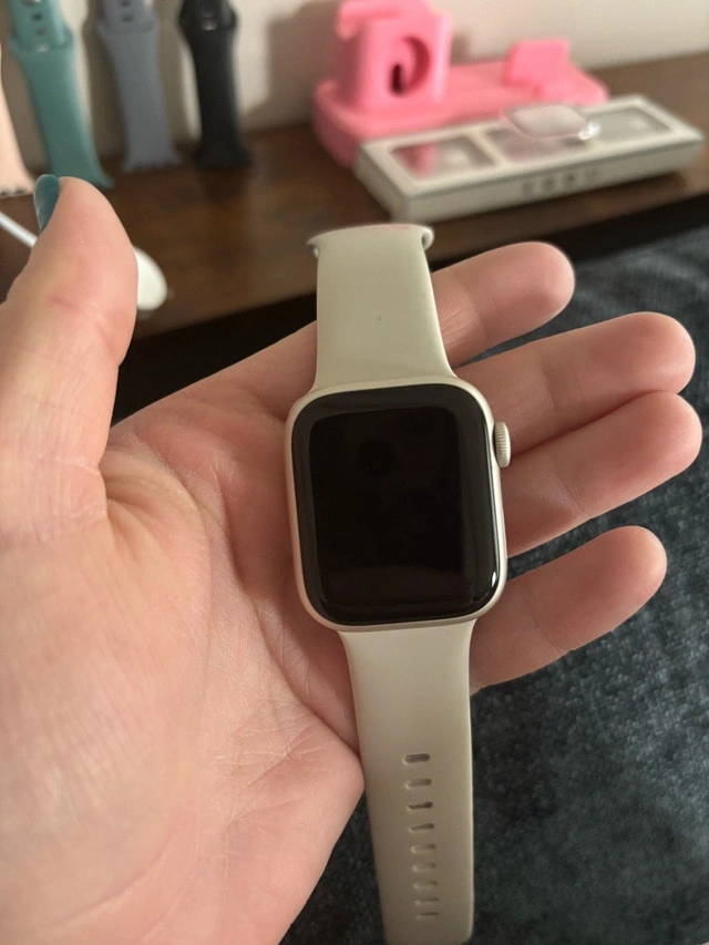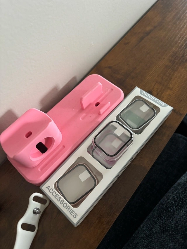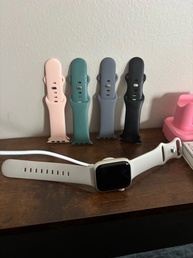 Apple Watch Series 9 in great condition. Works perfectly, just upgraded. Includes: Charger, pink charging stand, 4 extra bands, and 4 new screen protectors/cases. Minor normal wear, no issues.