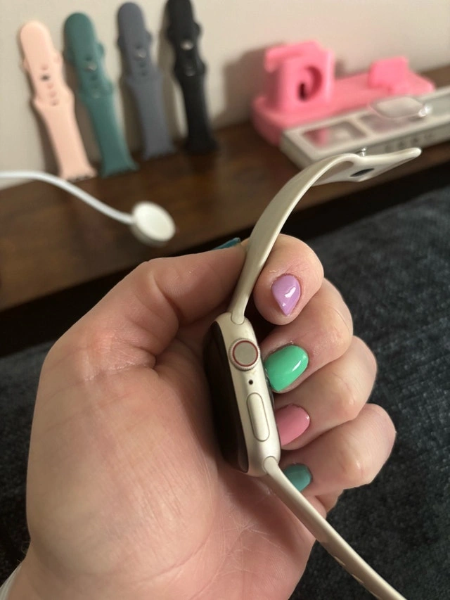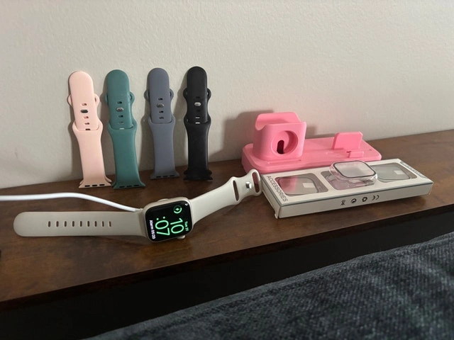 Apple Watch Series 9 in great condition. Works perfectly, just upgraded. Includes: Charger, pink charging stand, 4 extra bands, and 4 new screen protectors/cases. Minor normal wear, no issues.