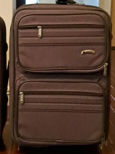 Brown Samsonite carry-on suitcase with multiple zippered pockets. It's a durable option for travel. Good for weekend trips or as a carry-on on flights!