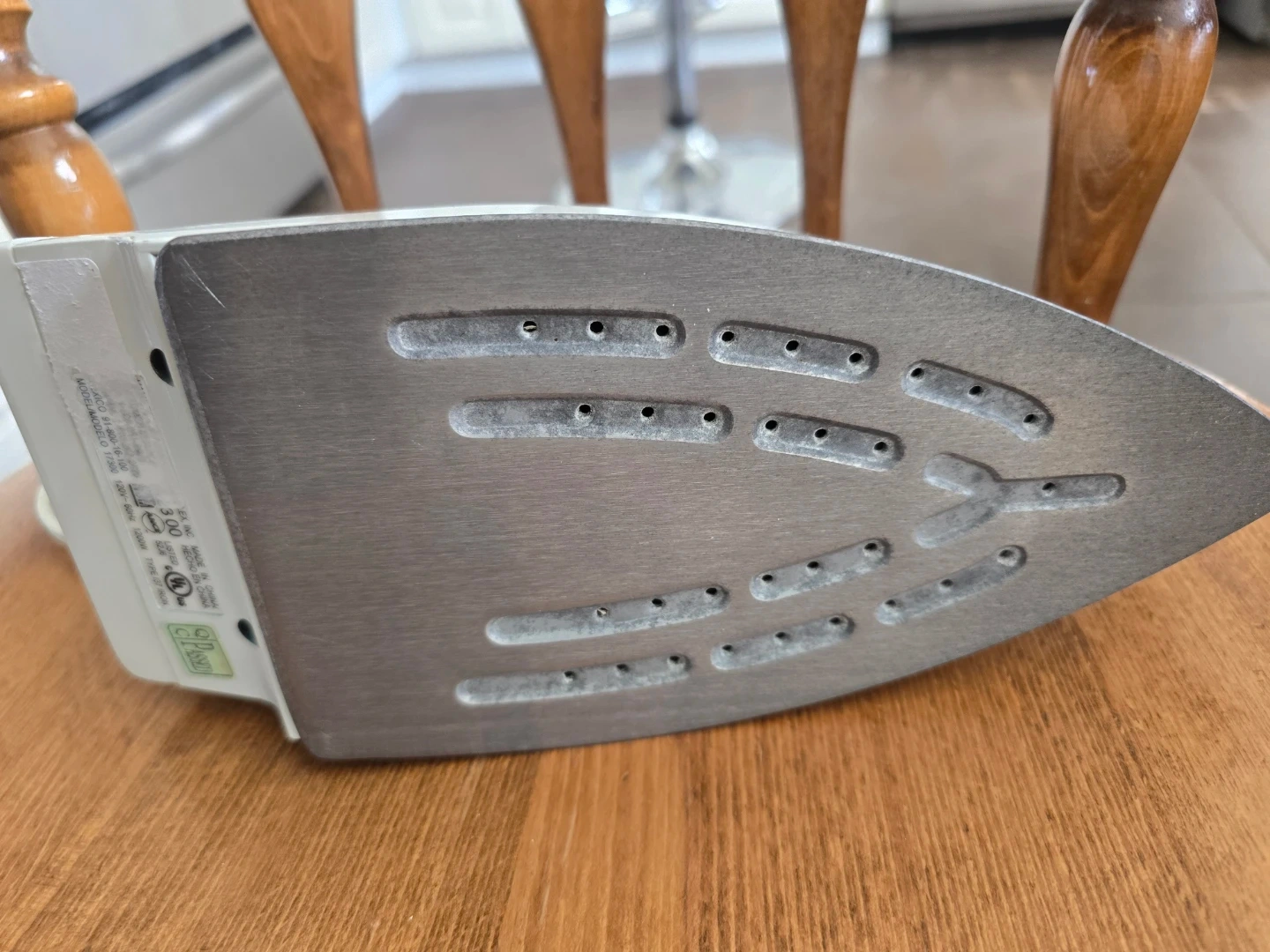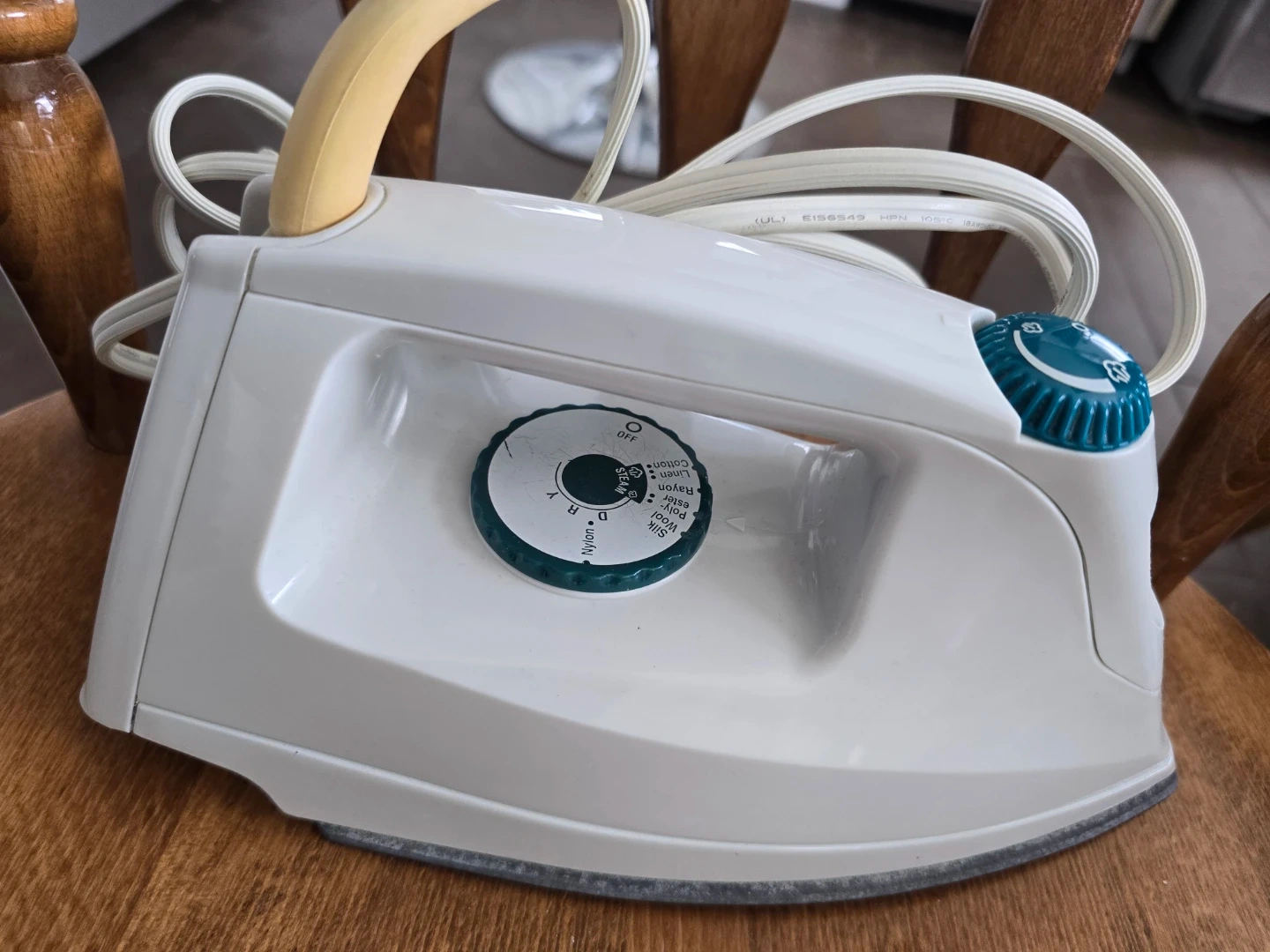 This is a white and yellow steam iron. It has an adjustable temperature dial for different fabric types. The soleplate is made of metal and designed for effective pressing.