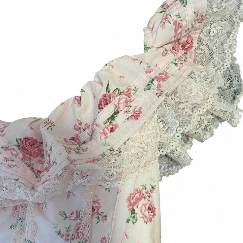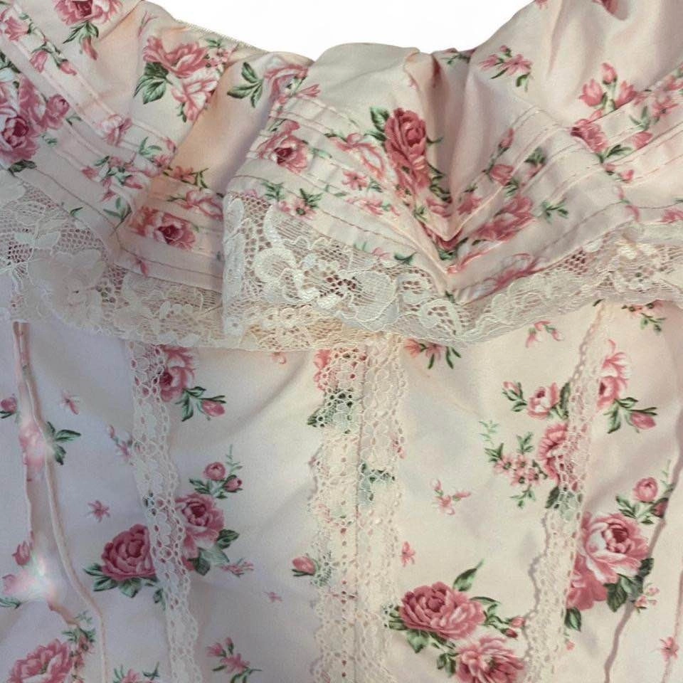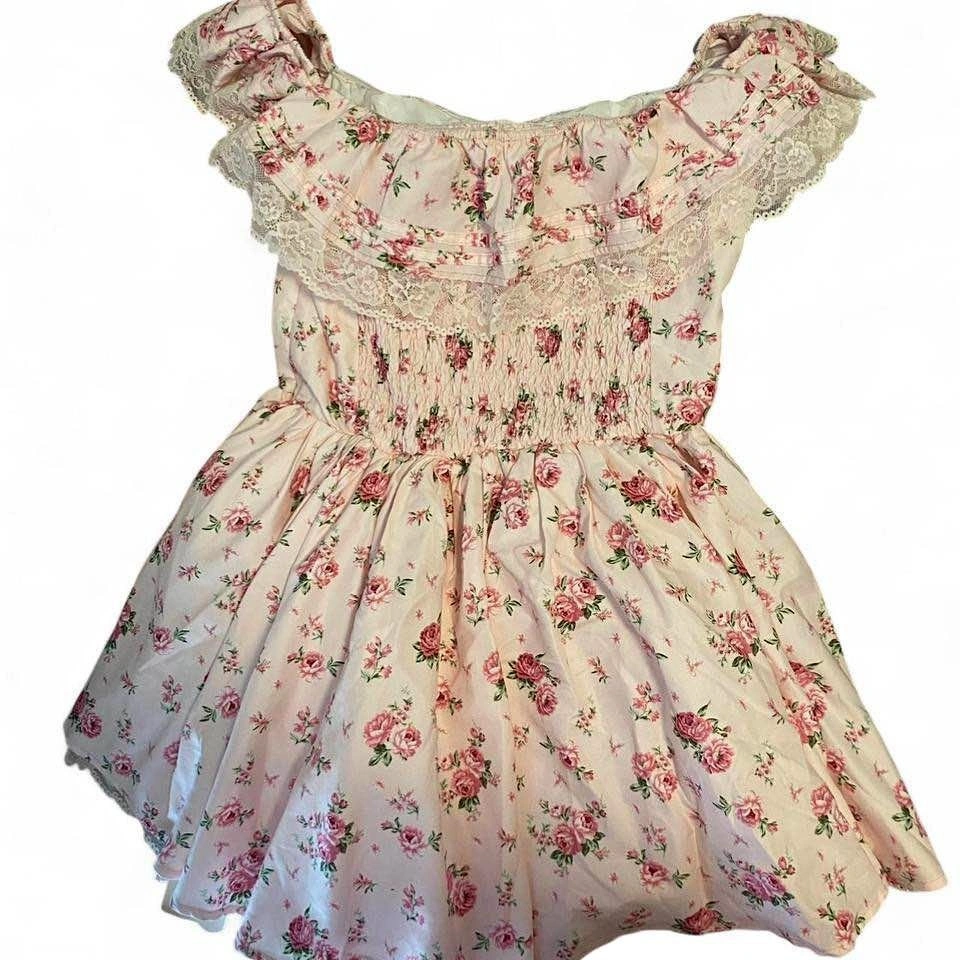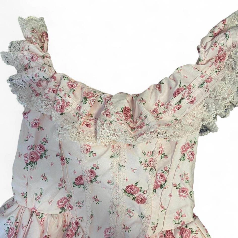 The prettiest pink frilly dress with a floral print and corset-style top. Super flattering and gives major coquette / cottagecore / soft girl vibes.