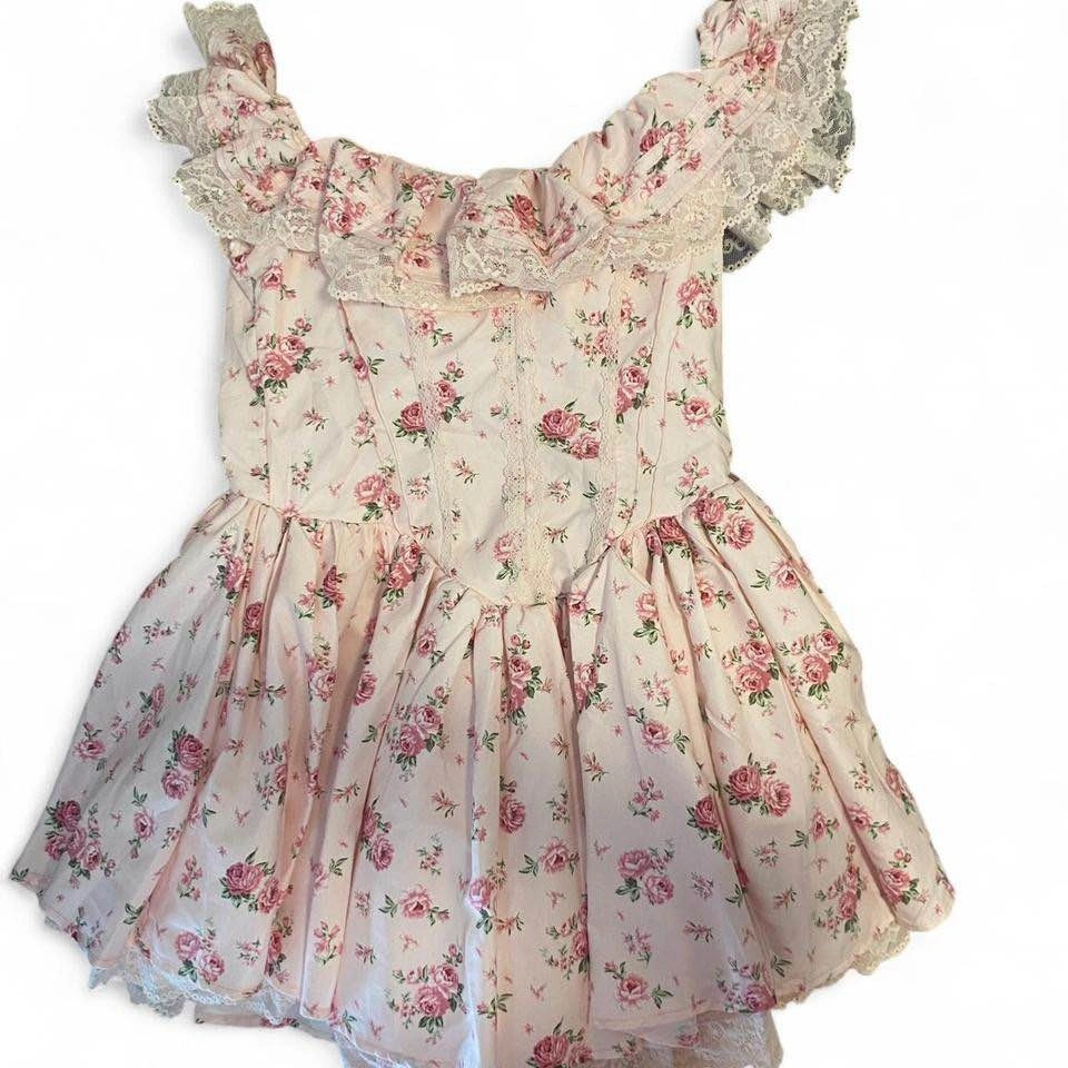 The prettiest pink frilly dress with a floral print and corset-style top. Super flattering and gives major coquette / cottagecore / soft girl vibes.