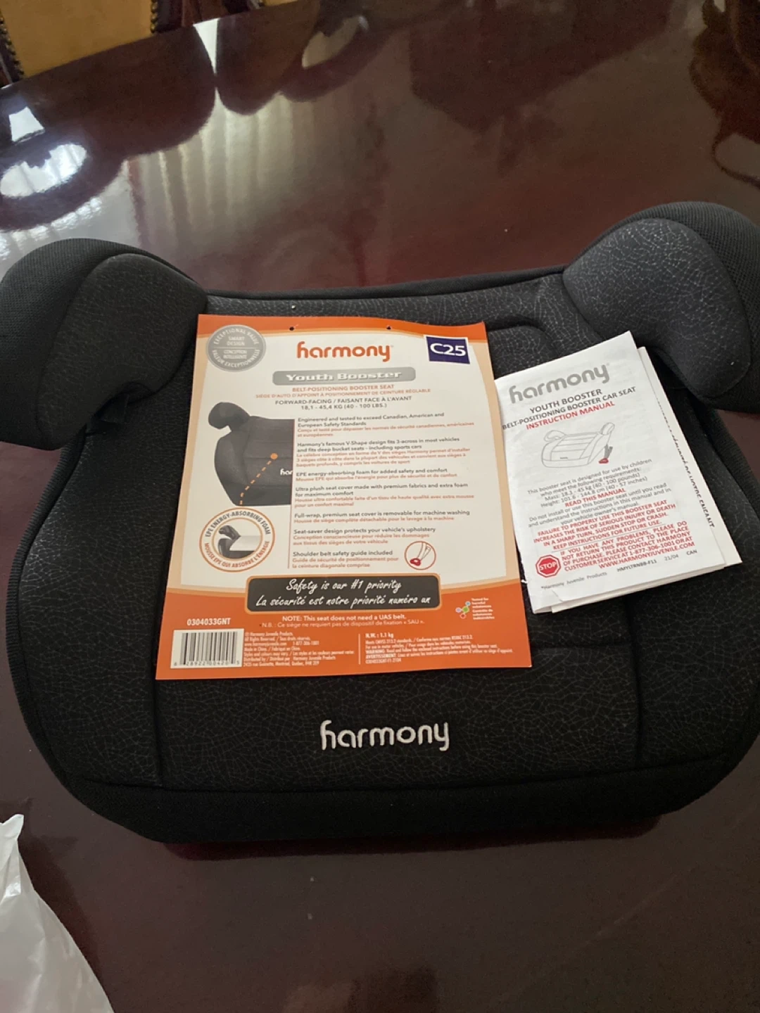This is a Harmony Youth Booster car seat designed for forward-facing use. It features a V-shape design and EPE energy-absorbing foam for safety. The seat cover is removable for machine washing and includes a shoulder belt safety guide.