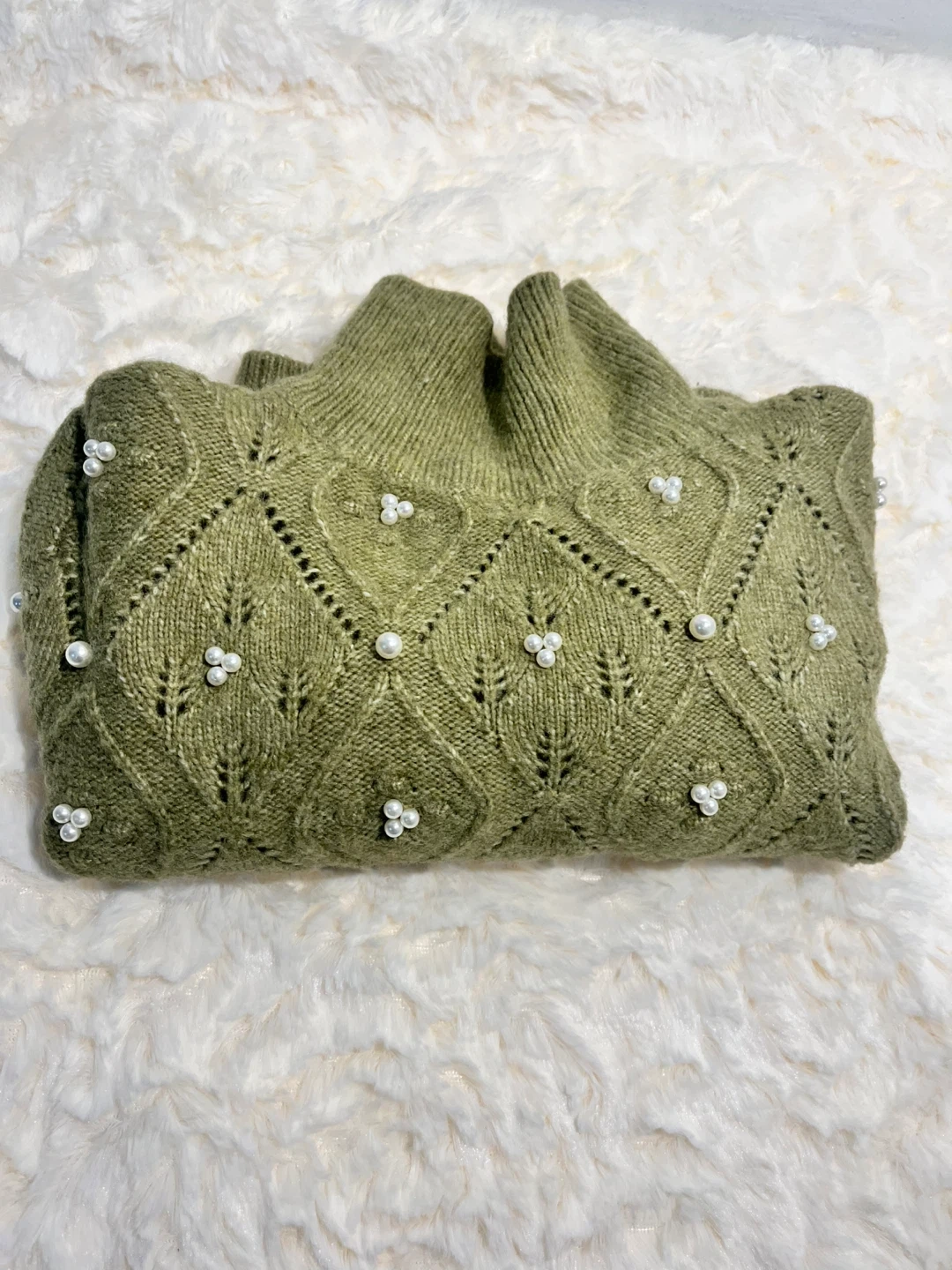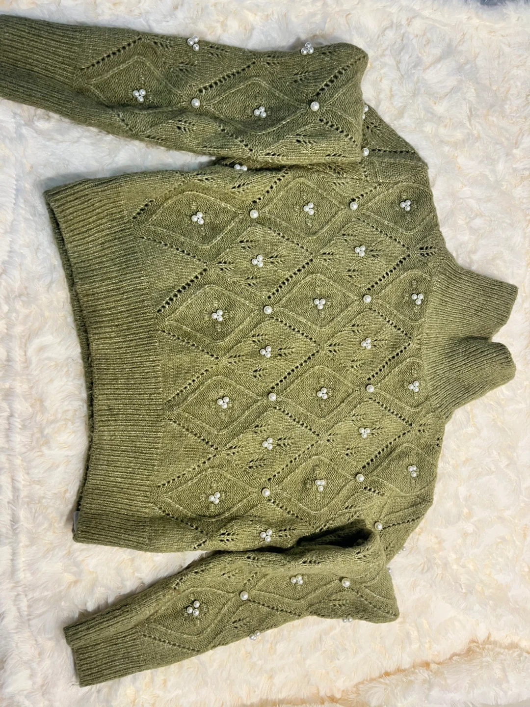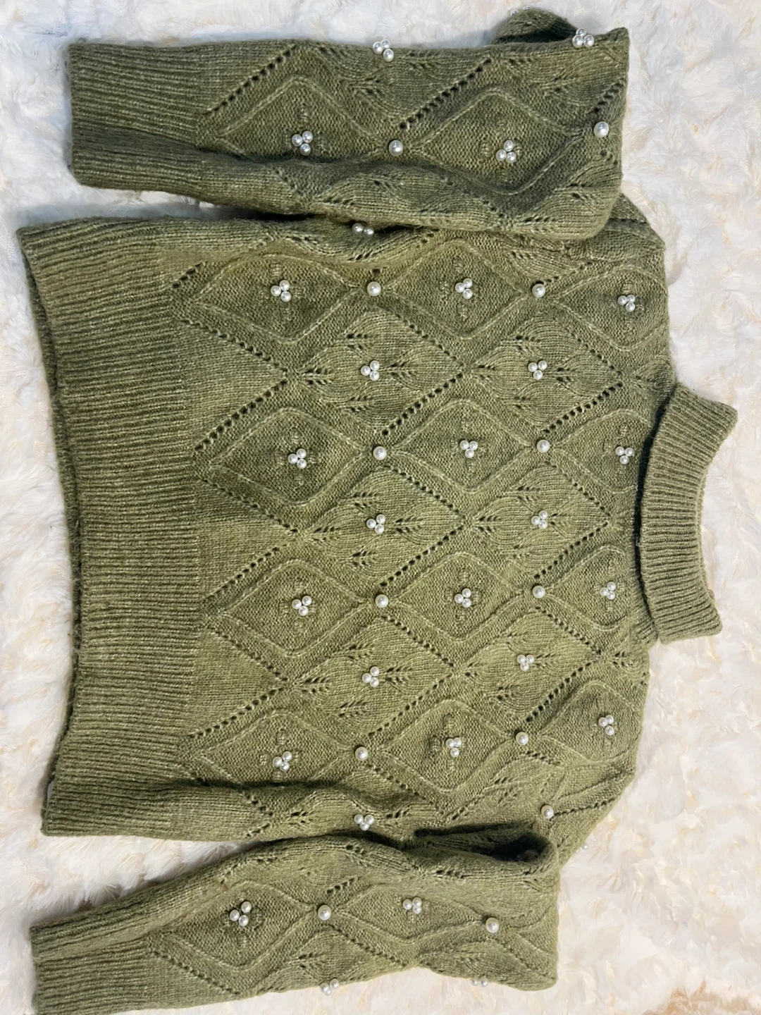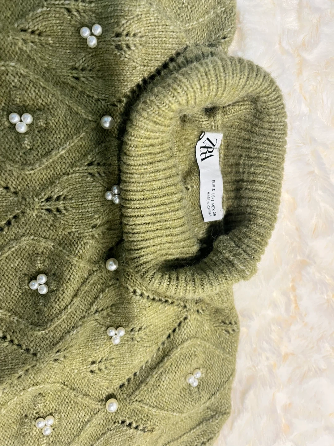 Buy & SellZara Green Knit Sweater with PearlsZara Green Knit Sweater with Pearls$15A green knit sweater with pearl detailing. It features a mock neck and a diamond cable knit pattern with open cut-outs. Made in Turkey.ConditionLike newSizeSmall BrandZaraWHERE TO MEETMount Dennis LRT Station – Main EntranceView MapSELLERverifiedYazminMount Dennis812 reviews0 chats·2 favorites·46 viewsSEND CHAT TO SELLERHi Yazmin! I’m interested in your listing.Hi Yazmin! I’m interested in your listing.Get the Karrot app to chatSign In to chat