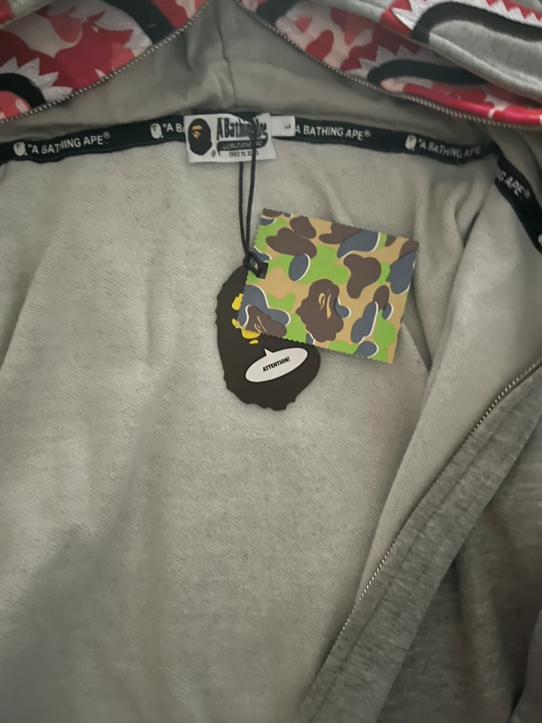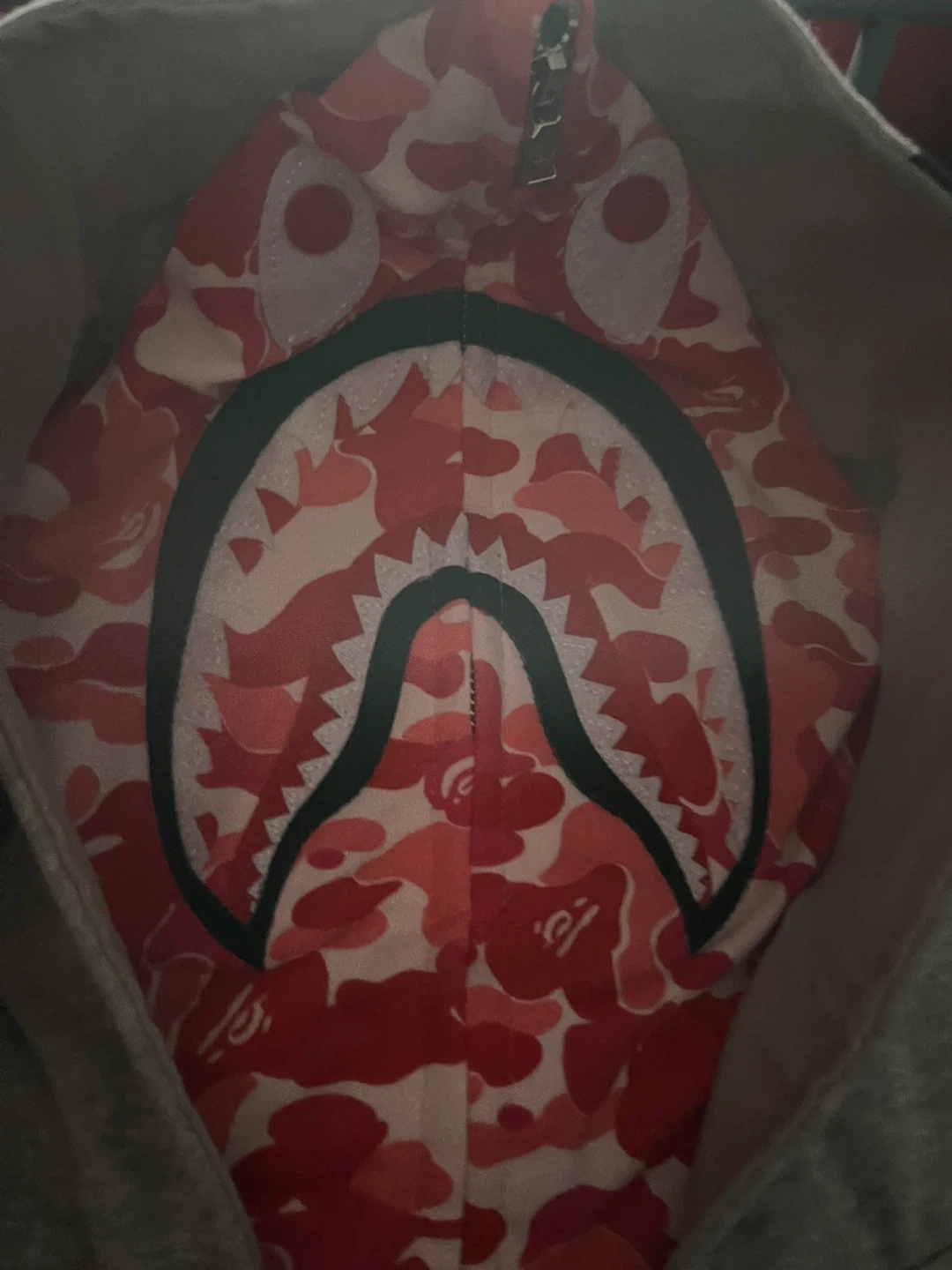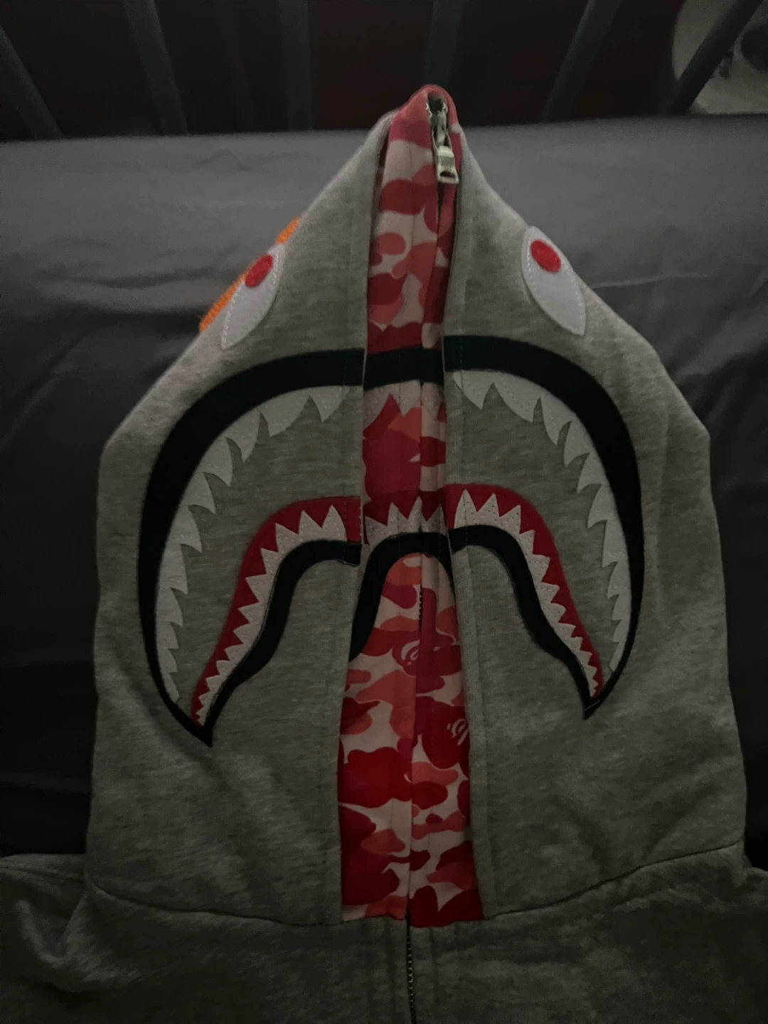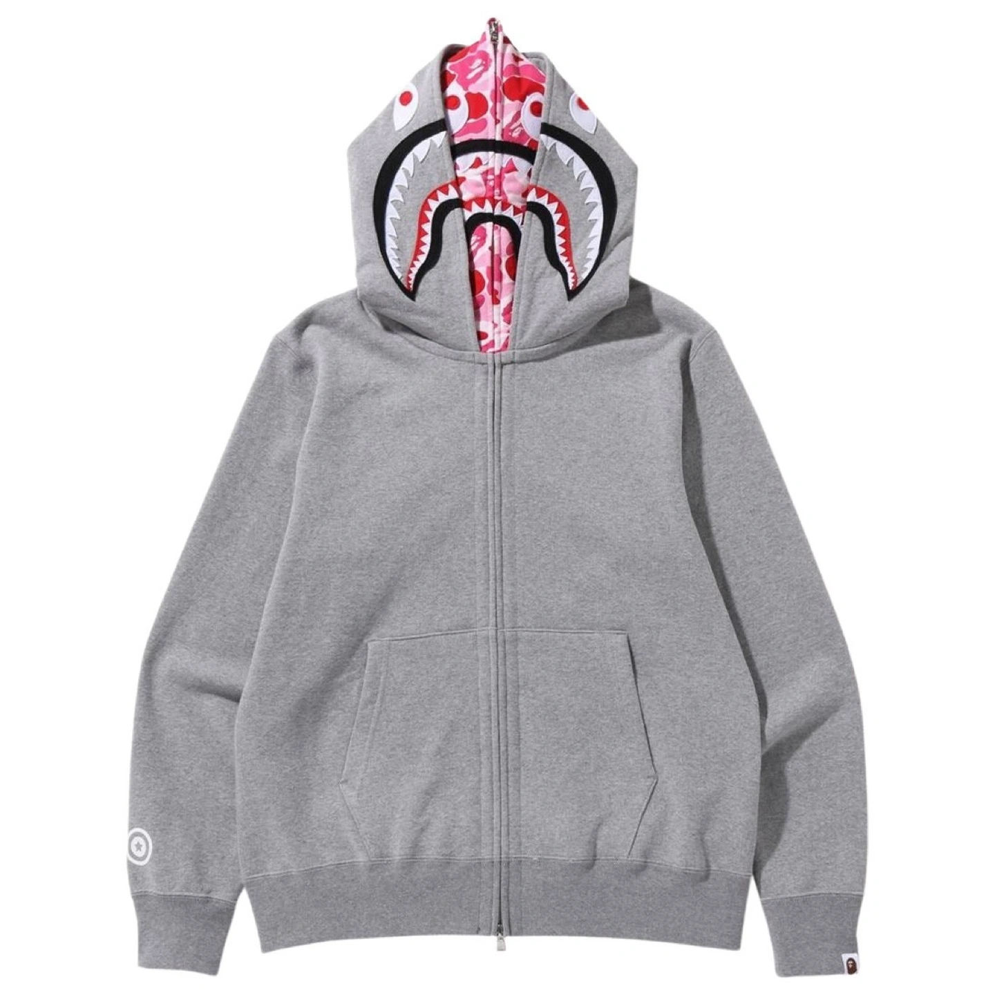 This is a BAPE Shark Full Zip Hoodie. It's grey with the iconic shark graphic on the hood. The lining features a pink camouflage pattern. It's a statement piece for any streetwear collection!