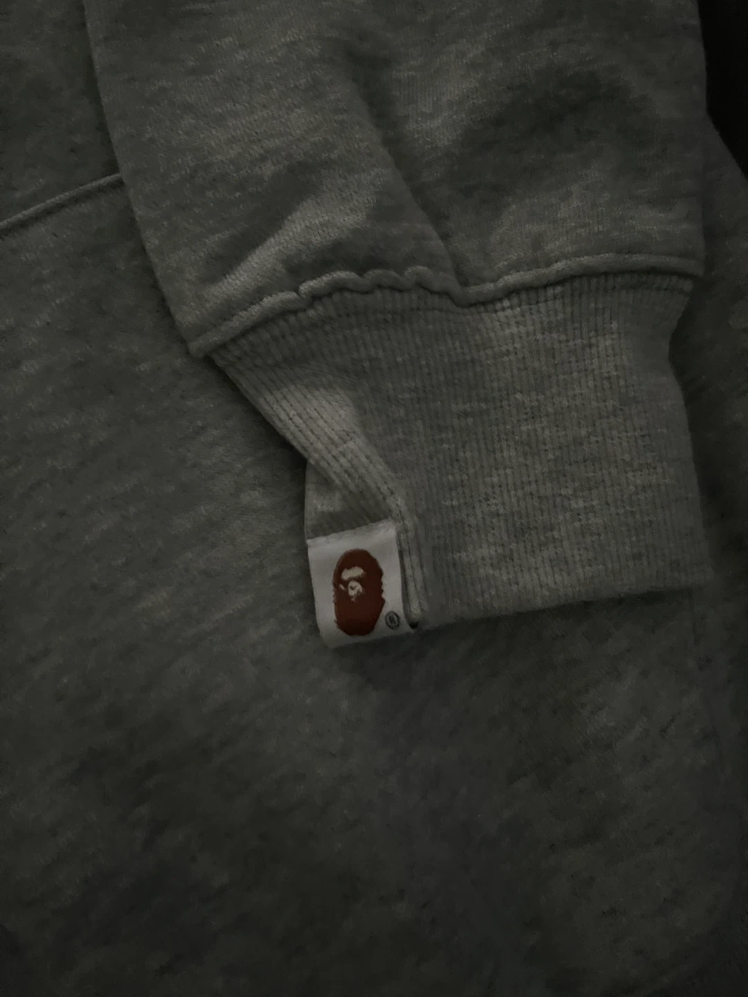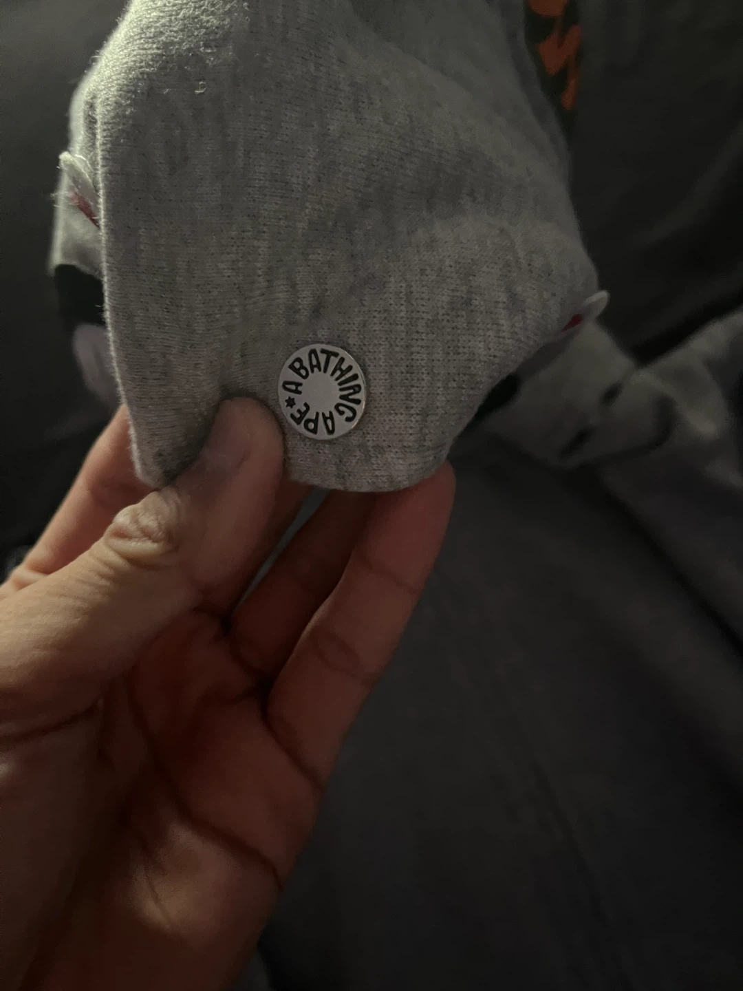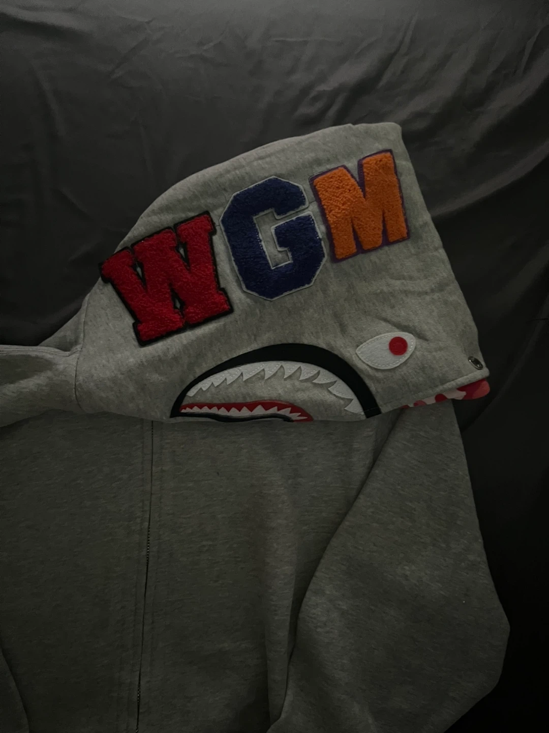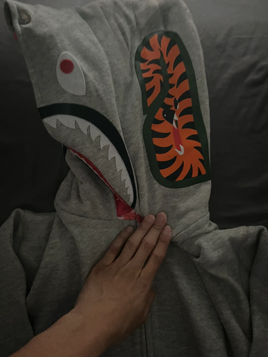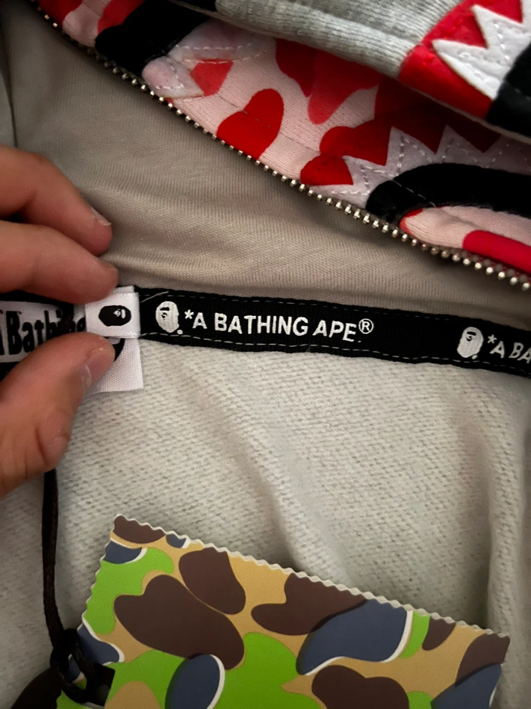 This is a BAPE Shark Full Zip Hoodie. It's grey with the iconic shark graphic on the hood. The lining features a pink camouflage pattern. It's a statement piece for any streetwear collection!