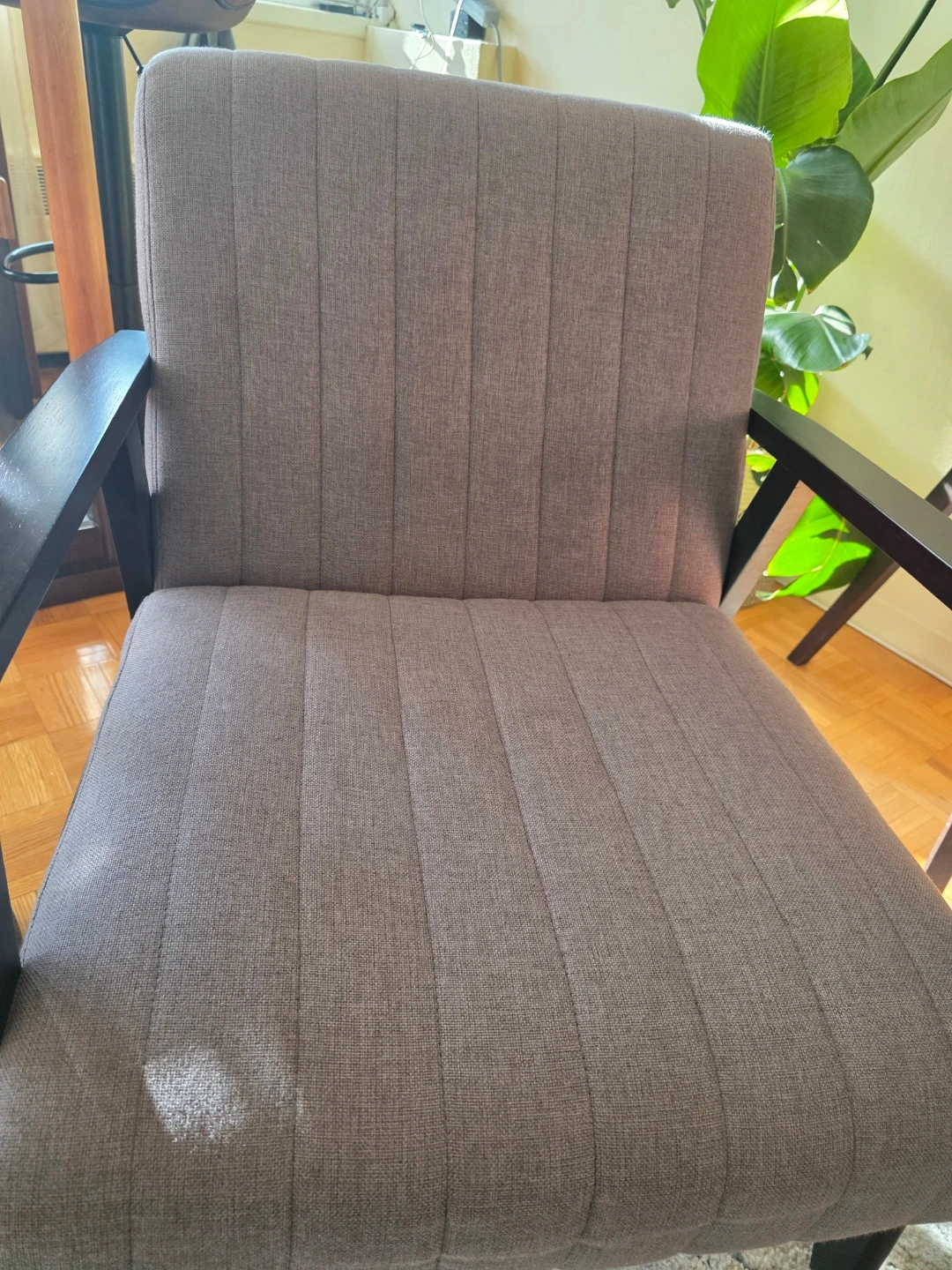 Selling a set of two armchairs. They have a grey fabric seat and back with dark wood arms and legs. They're in good condition and would be great for a living room or den
