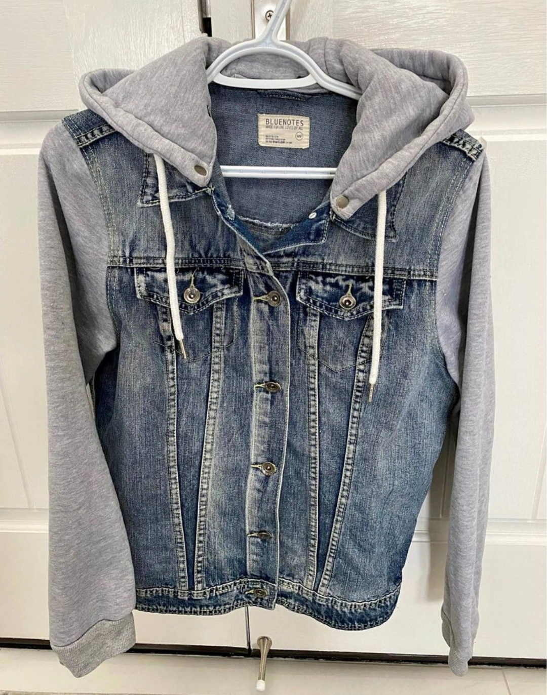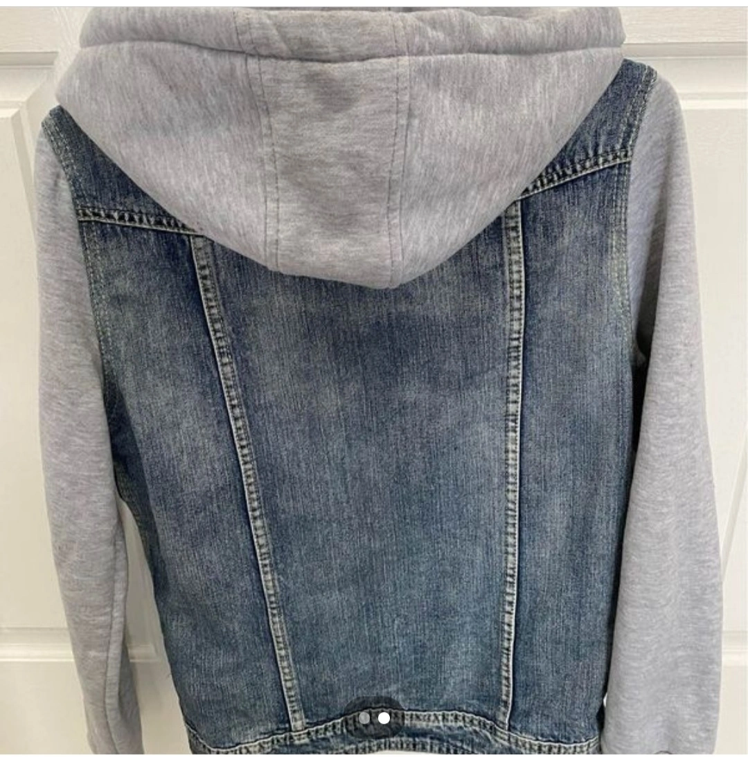Selling a Bluenotes denim jacket with a grey hood. It's in great condition and perfect for layering!