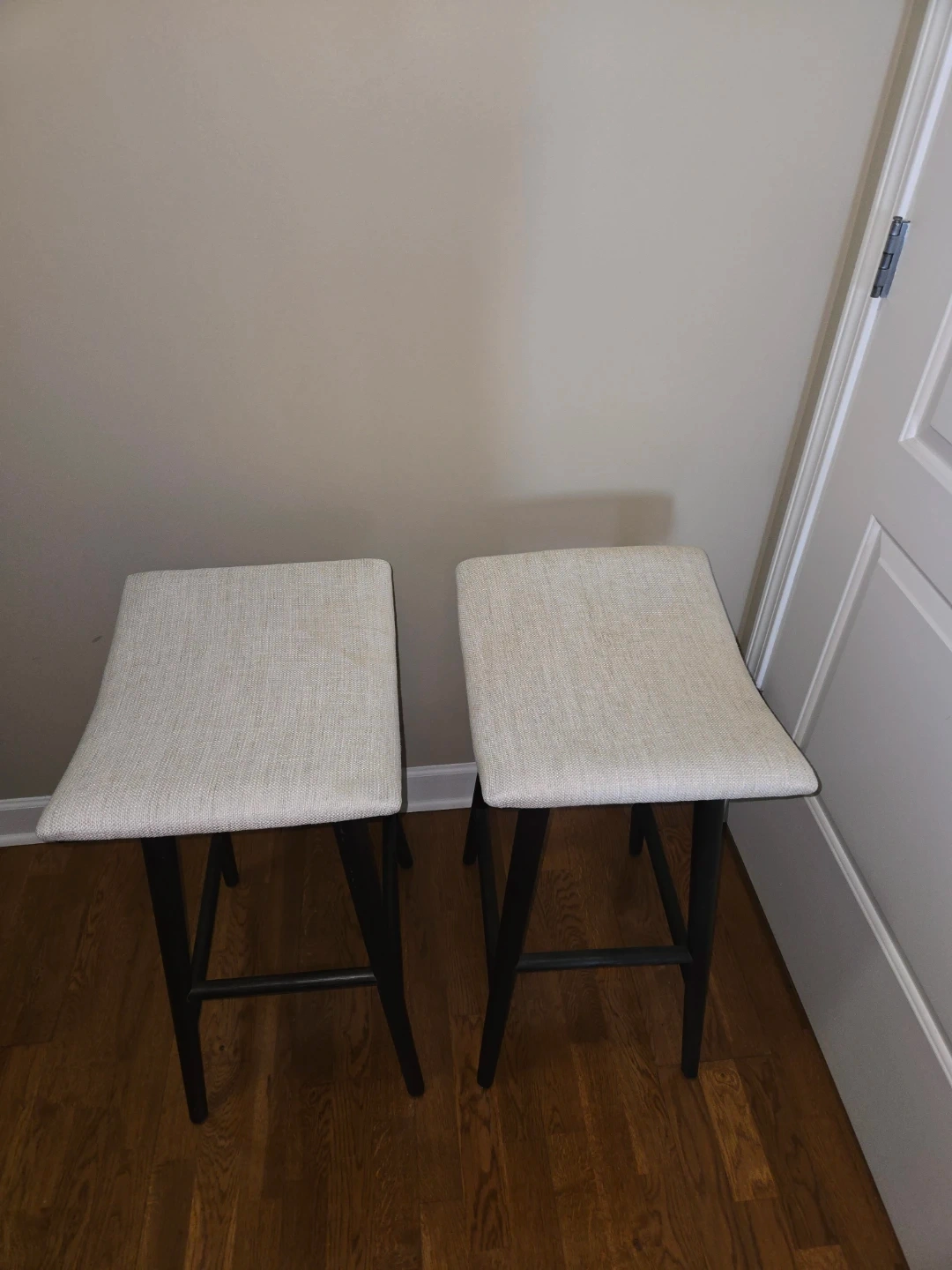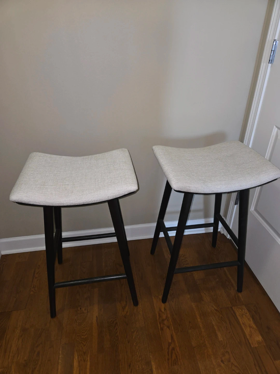 Selling two Four Hands Union Saddle Stools. They are ready for a new home! The outer cover is made of 18% polyester, 18% cotton, 11% linen, and 49% viscose. The stools are 28 inches tall.