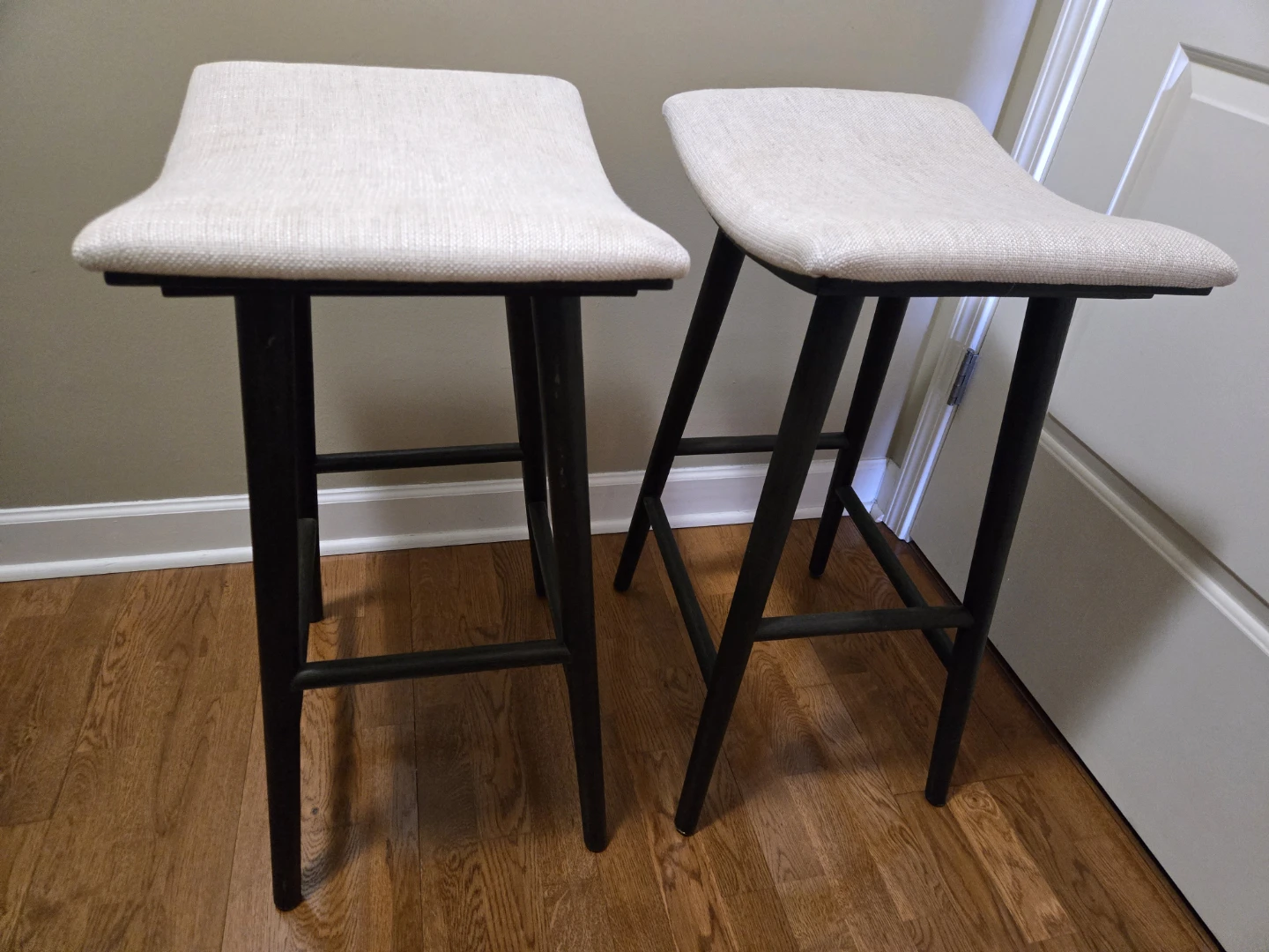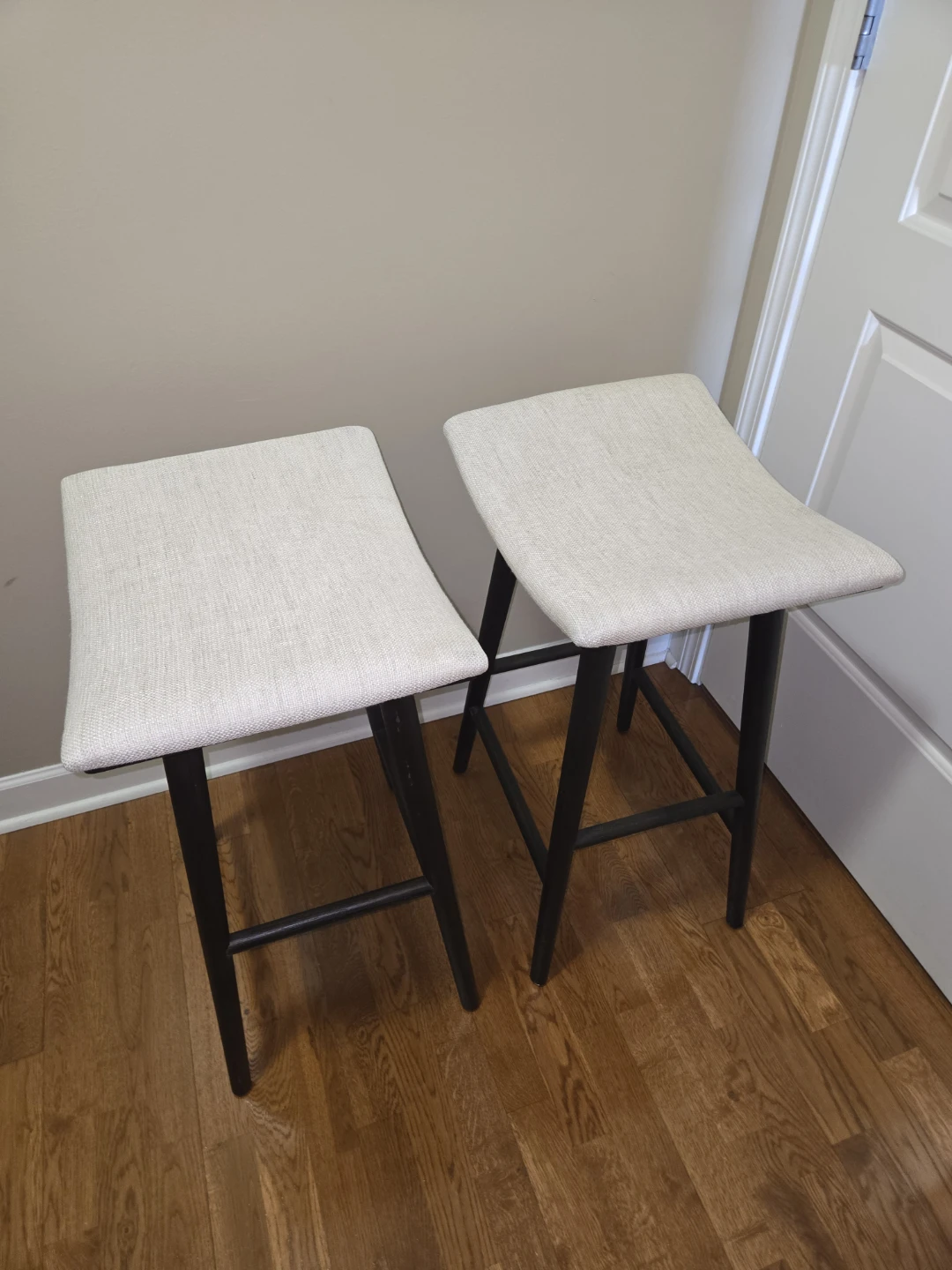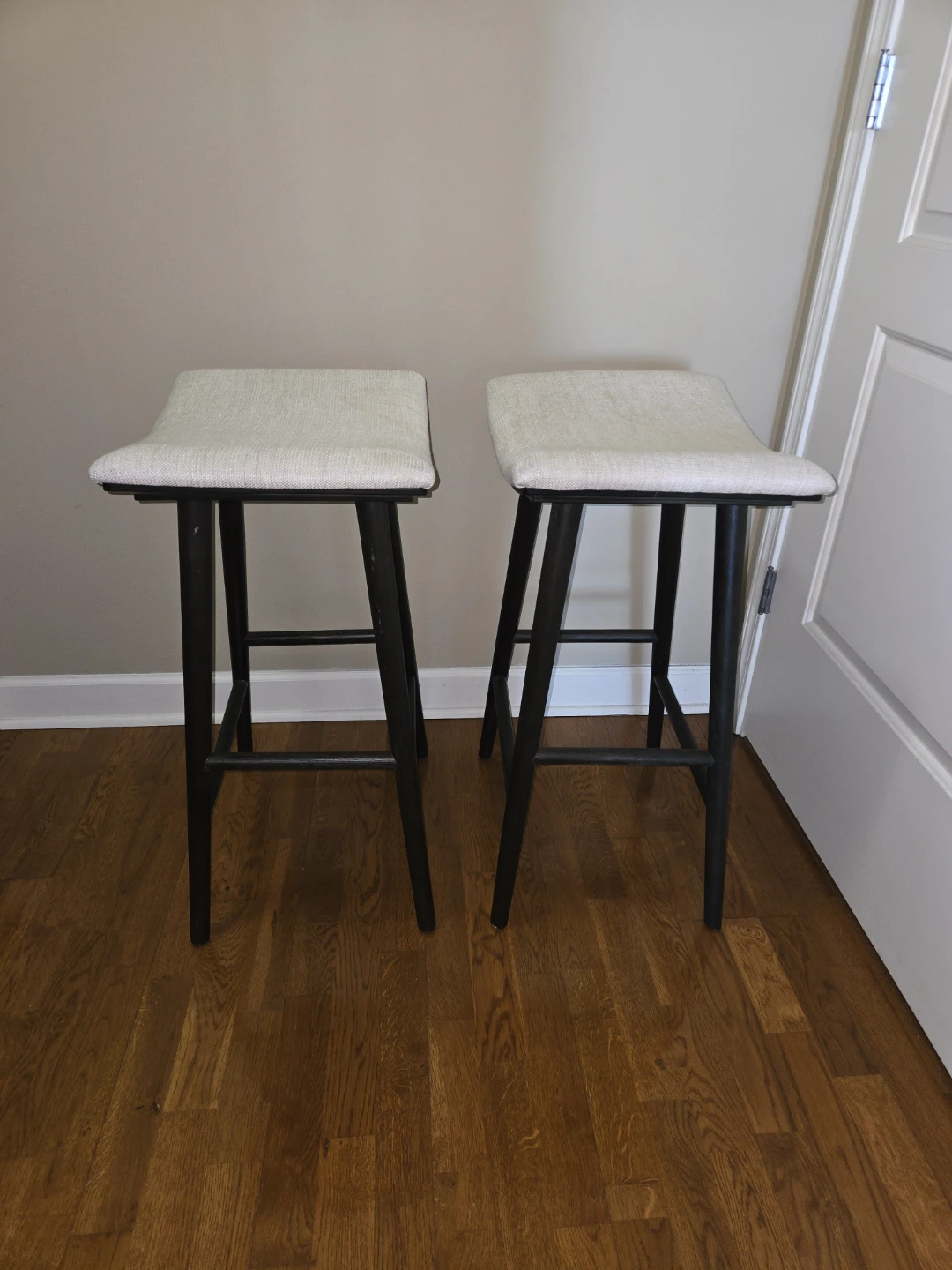 Selling two Four Hands Union Saddle Stools. They are ready for a new home! The outer cover is made of 18% polyester, 18% cotton, 11% linen, and 49% viscose. The stools are 28 inches tall.