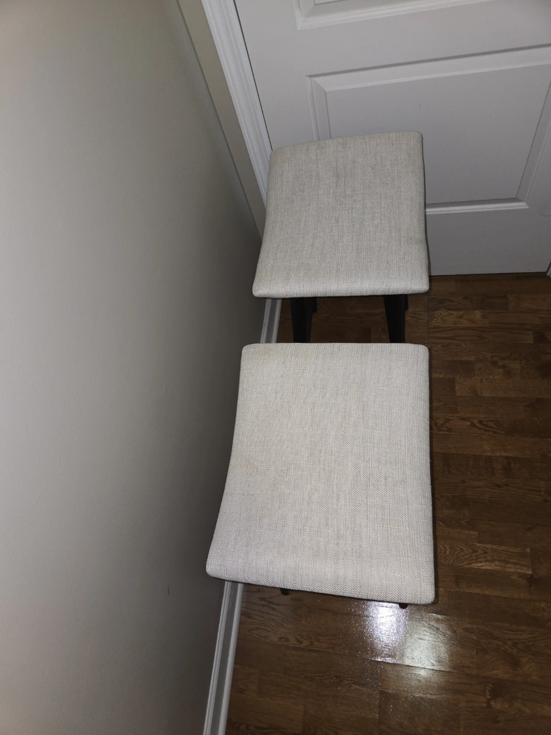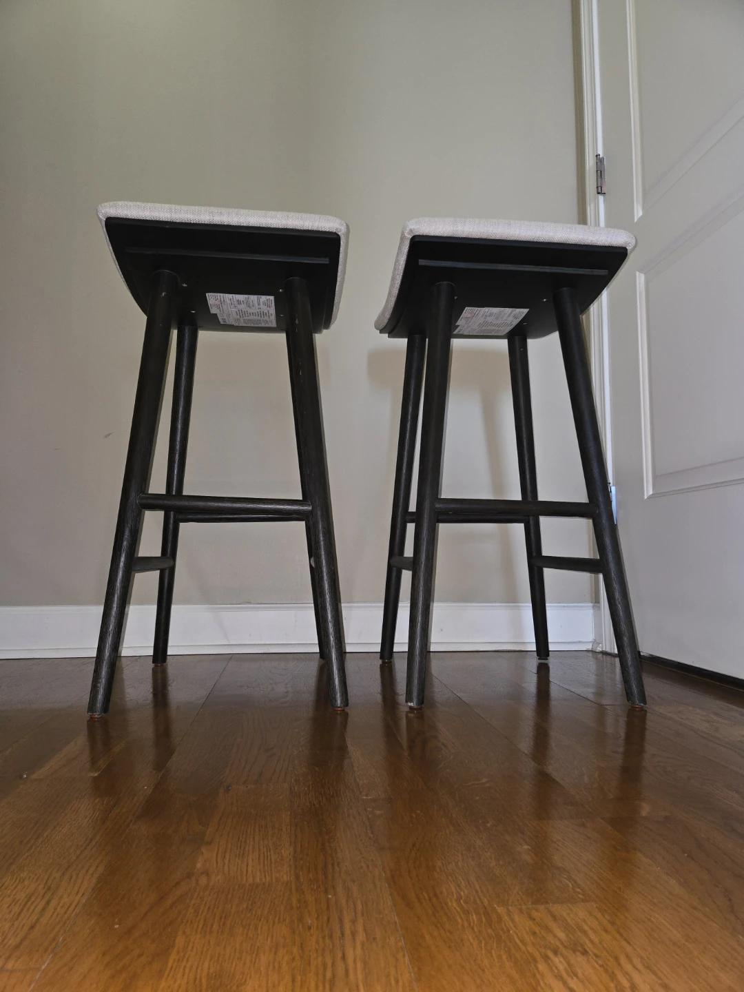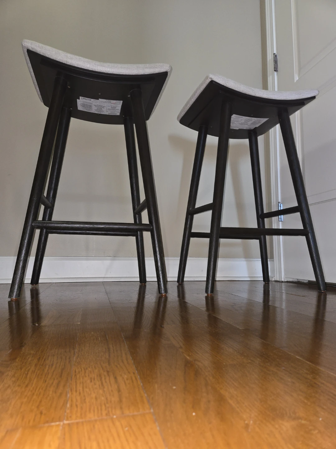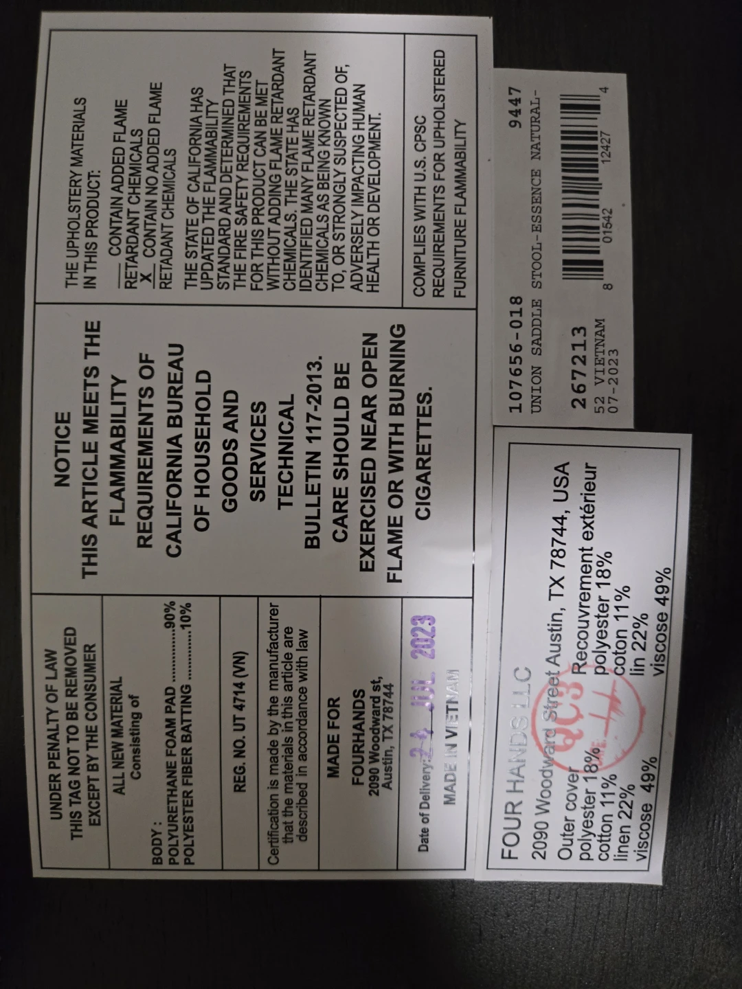 Selling two Four Hands Union Saddle Stools. They are ready for a new home! The outer cover is made of 18% polyester, 18% cotton, 11% linen, and 49% viscose. The stools are 28 inches tall.