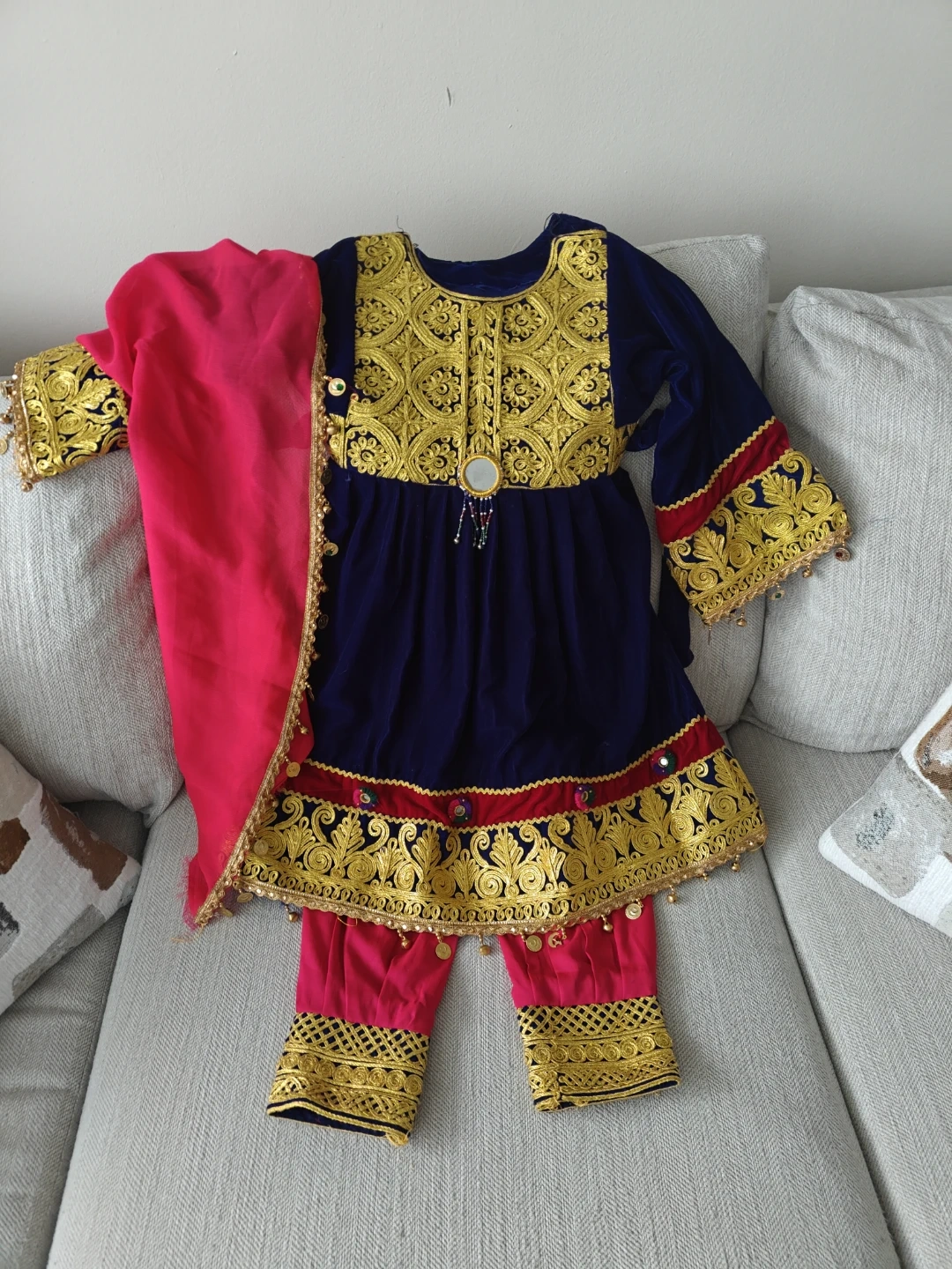 This is a beautiful navy blue velvet Afghan dress set for girls, featuring intricate gold embroidery. It comes with matching pink pants and a vibrant pink scarf. The outfit is embellished with decorative beads and gold trim, perfect for special occasions.