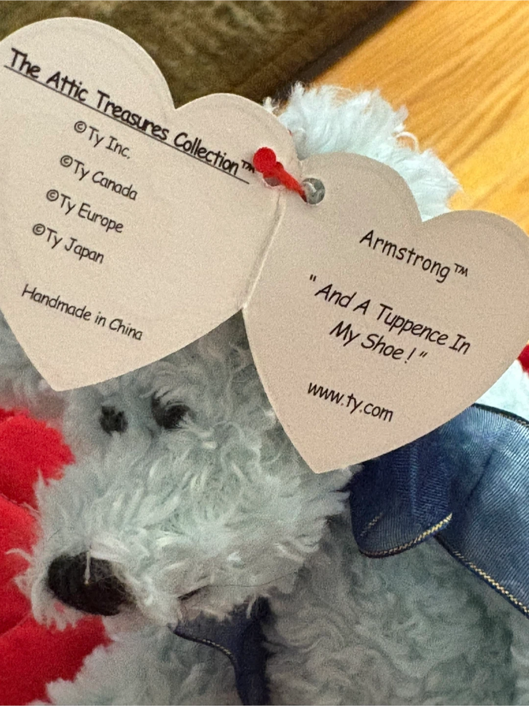 10Selling a cute Ty Attic Treasures Collection bear named Armstrong! This adorable bear is handmade in China and part of the Attic Treasures series. It says 'And A Tuppence In My Shoe!' on the tag. Perfect for collectors or anyone who loves a cuddly friend Cash only buy five or more and get them for $10 each