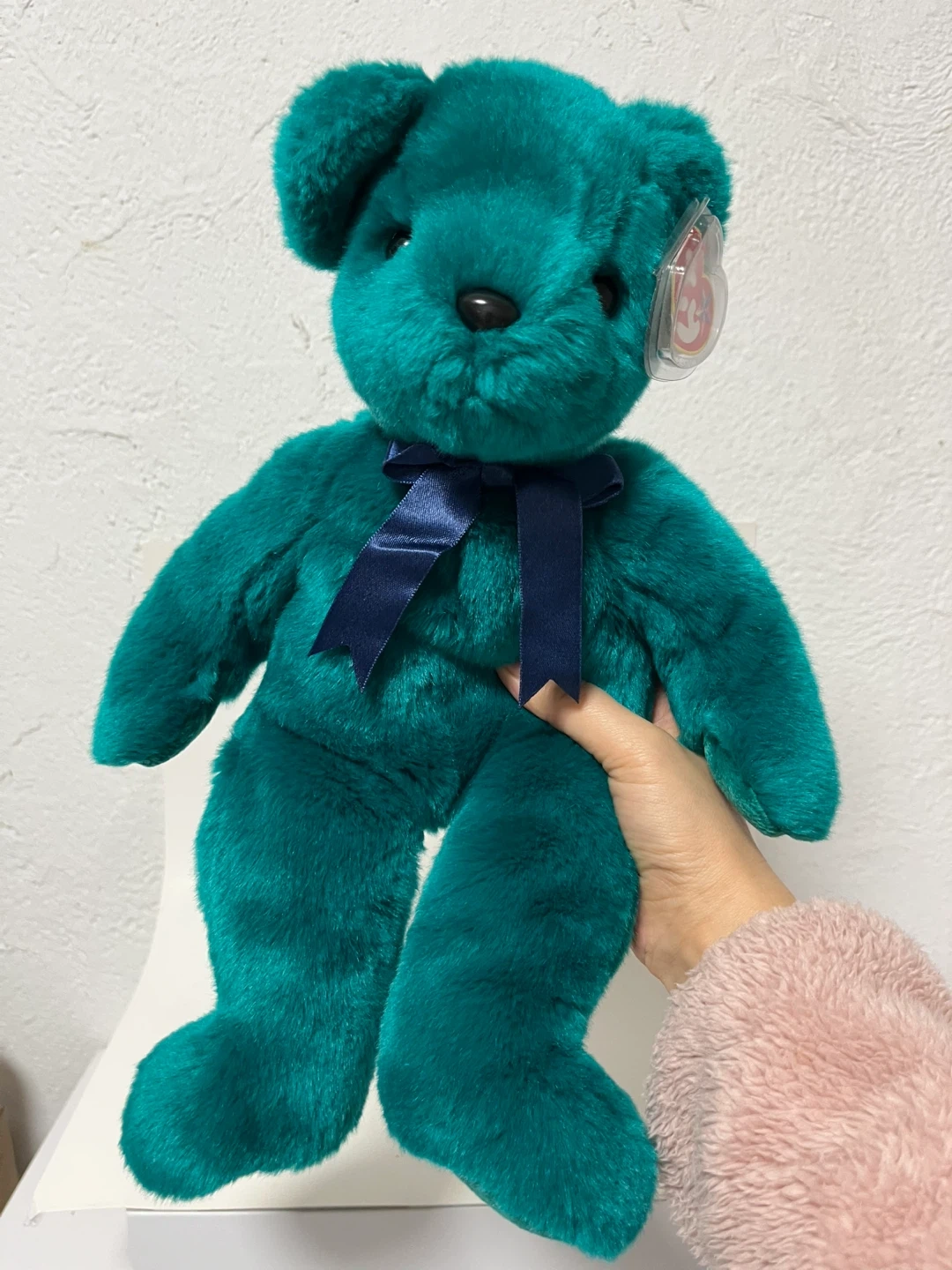 130Selling a Ty Beanie Baby named Erin the Bear! It's in great condition and would make a lovely addition to any collection or a cuddly friend for a child. The bear is a vibrant teal colour and has a cute navy blue ribbon around its neck