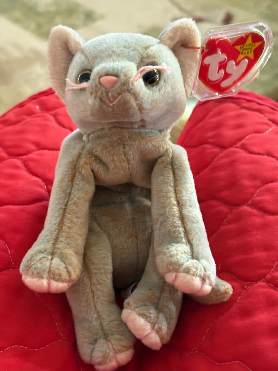 10Selling a Ty Beanie Baby named Pounce. It's a cute grey cat plush with pink accents. The tag is still attached, so it's in great condition! Cash only by five or more and get them for $10 each