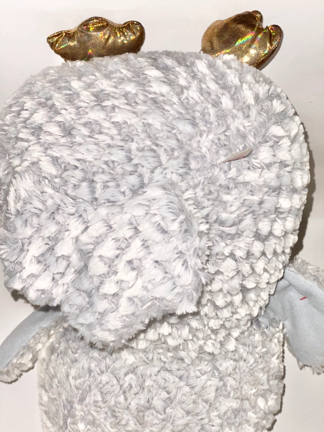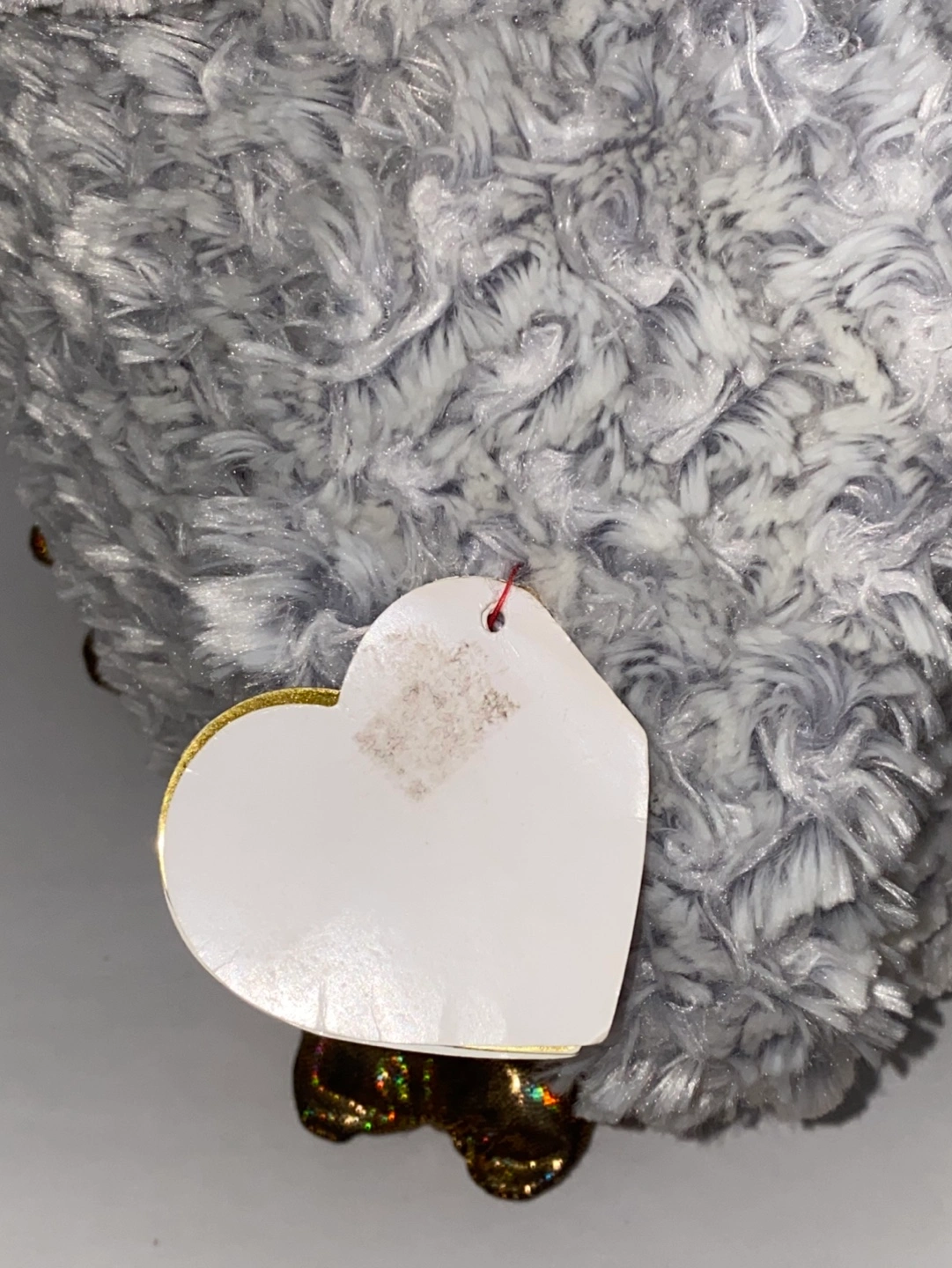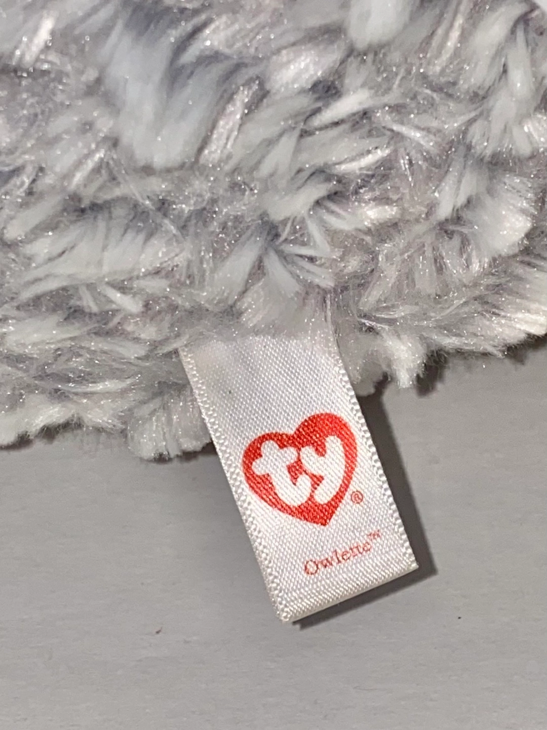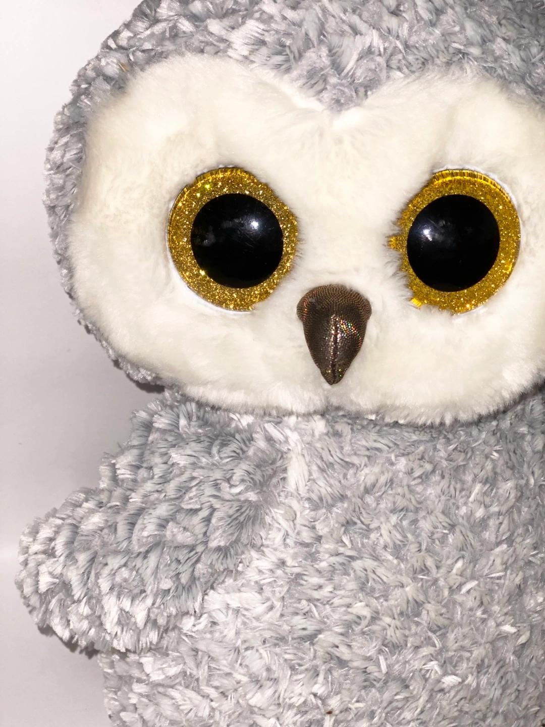 Grey and white plush owl. Large, sparkly eyes. Gold accents on feet and beak. Soft, fluffy fur. Ty heart-shaped tag attached. Measures at 16” in height. There is some scuffing on the eyes and the seam has come undone on one of the wings. (Pickup in Chinguacousy and Remembrance)
