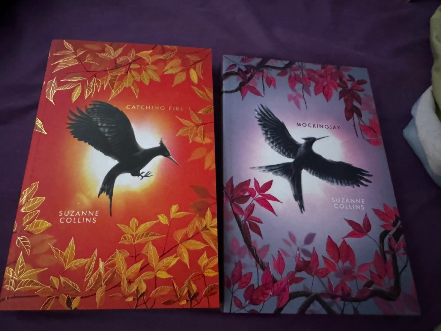 Two captivating novels from Suzanne Collins' "The Hunger Games" series are available. Includes "Catching Fire" and "Mockingjay", both featuring the iconic Mockingjay symbol. These books are a must-have for fans of dystopian fiction!