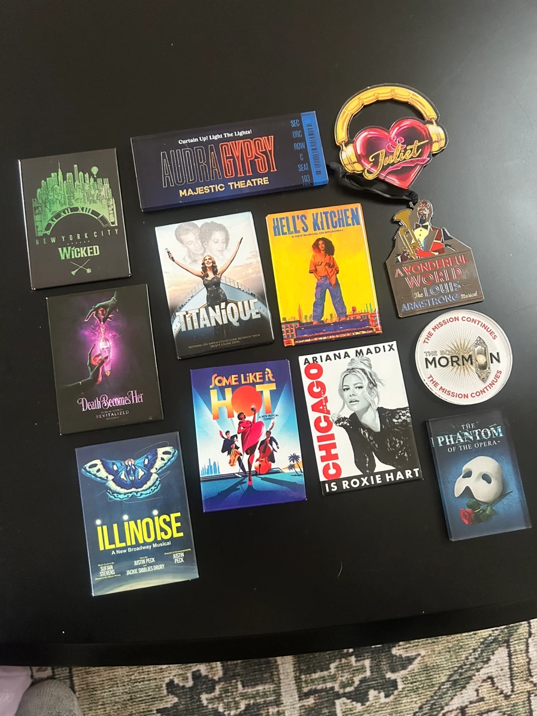 Collection of souvenir items from various Broadway musicals. Includes items from Wicked, Gypsy, Hell's Kitchen, and others. These are keepsakes from theatrical productions.