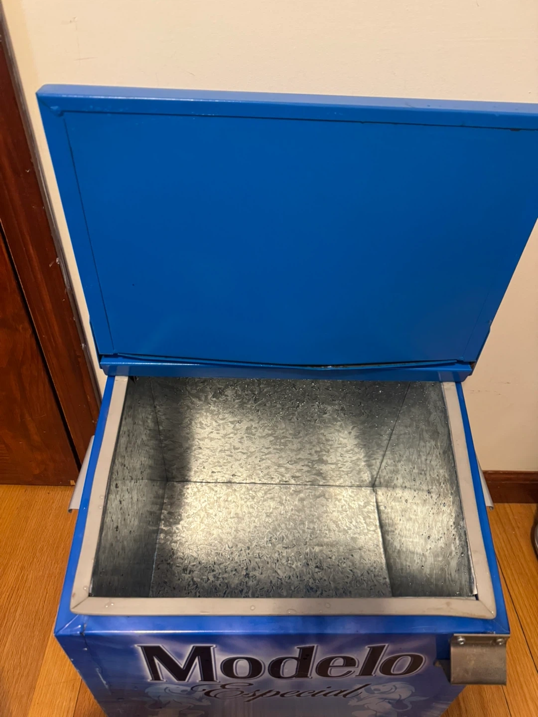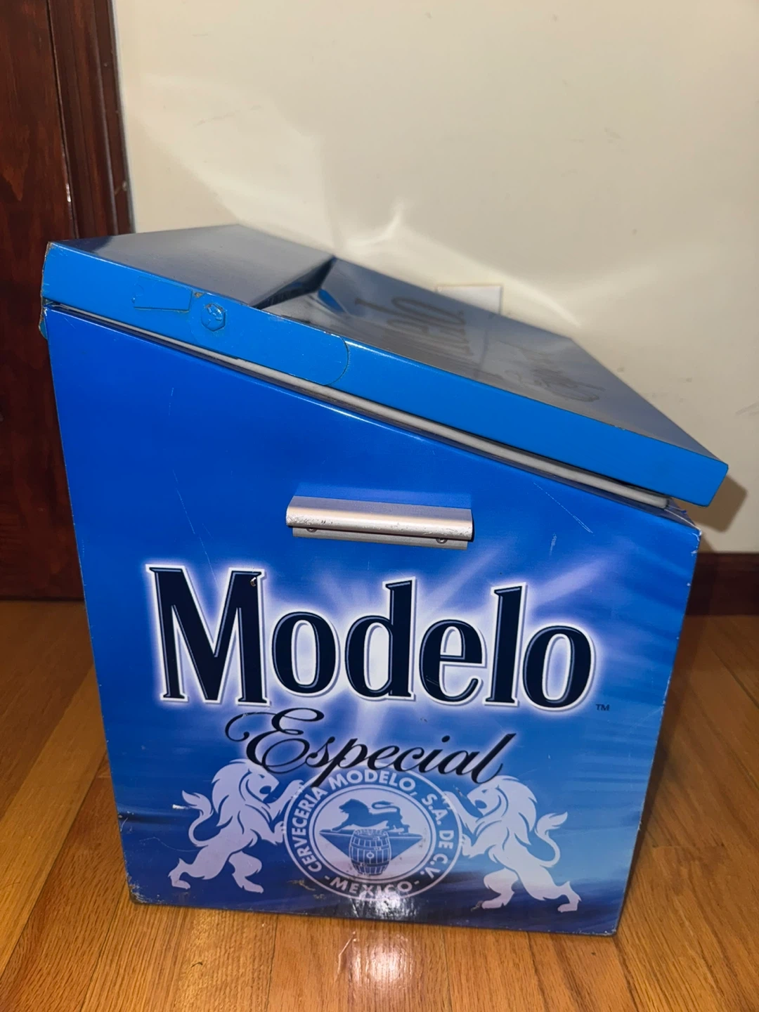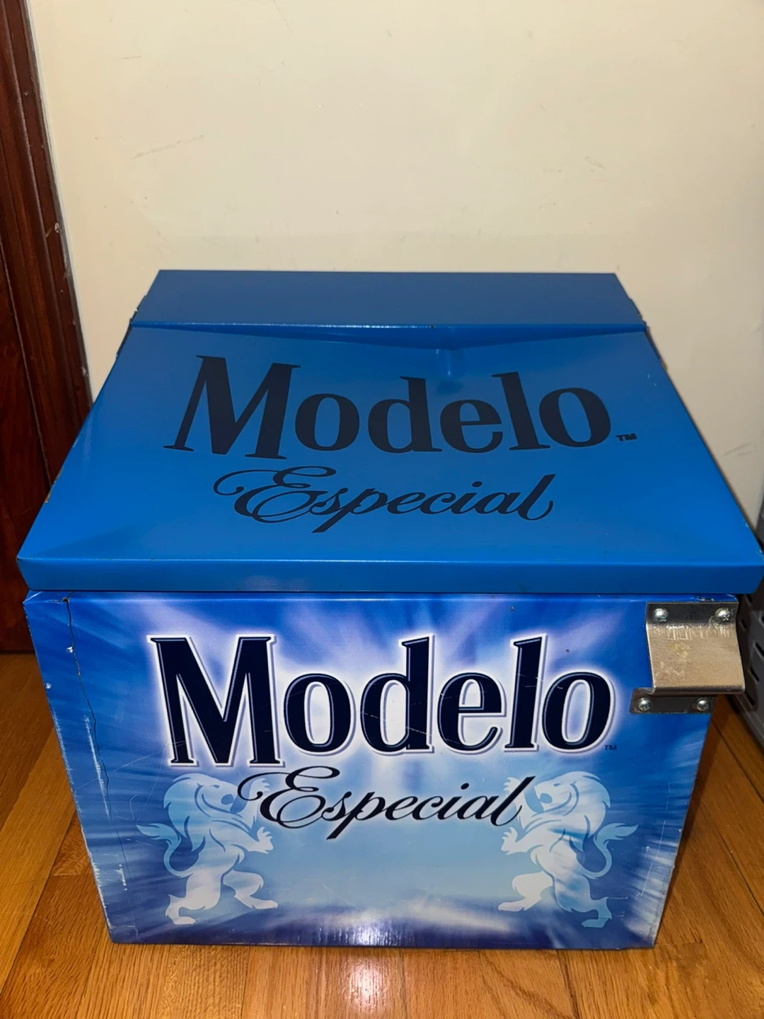 The Modelo Especial Blue Metal Breweriana Collectible Beer Cooler is a unique and stylish piece perfect for beer enthusiasts and collectors. Has some wear on it and paint chipping but it does the job for keeping your items cool. Plus it’s a collectors cooler.
