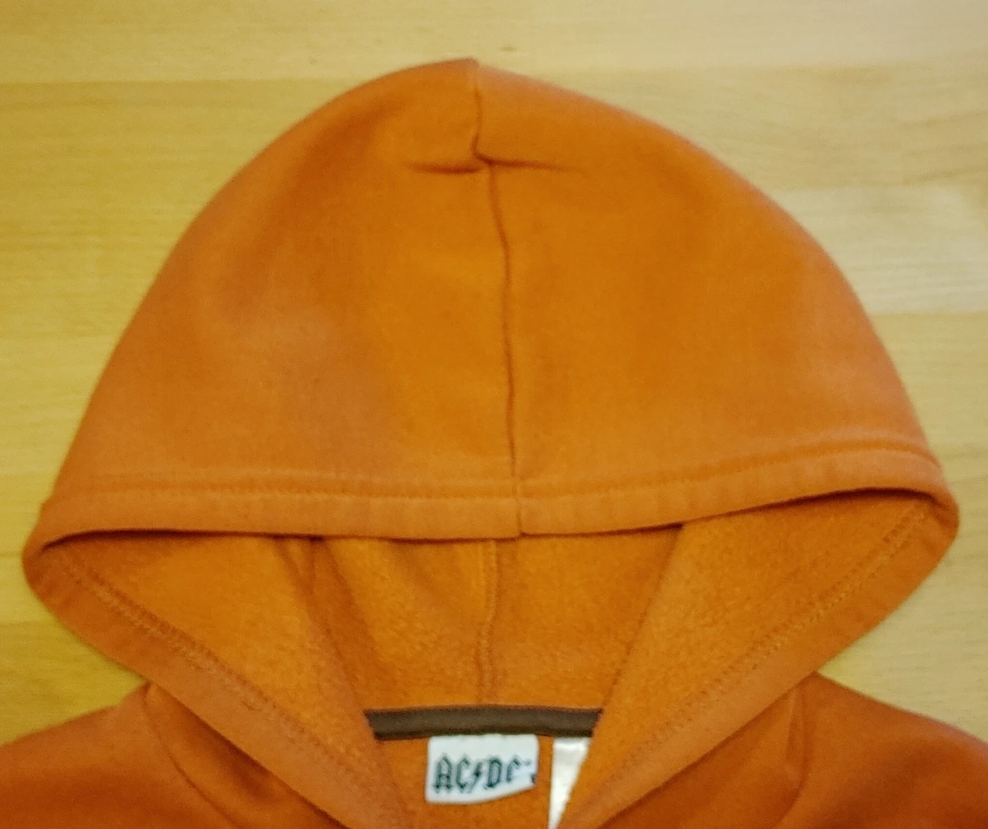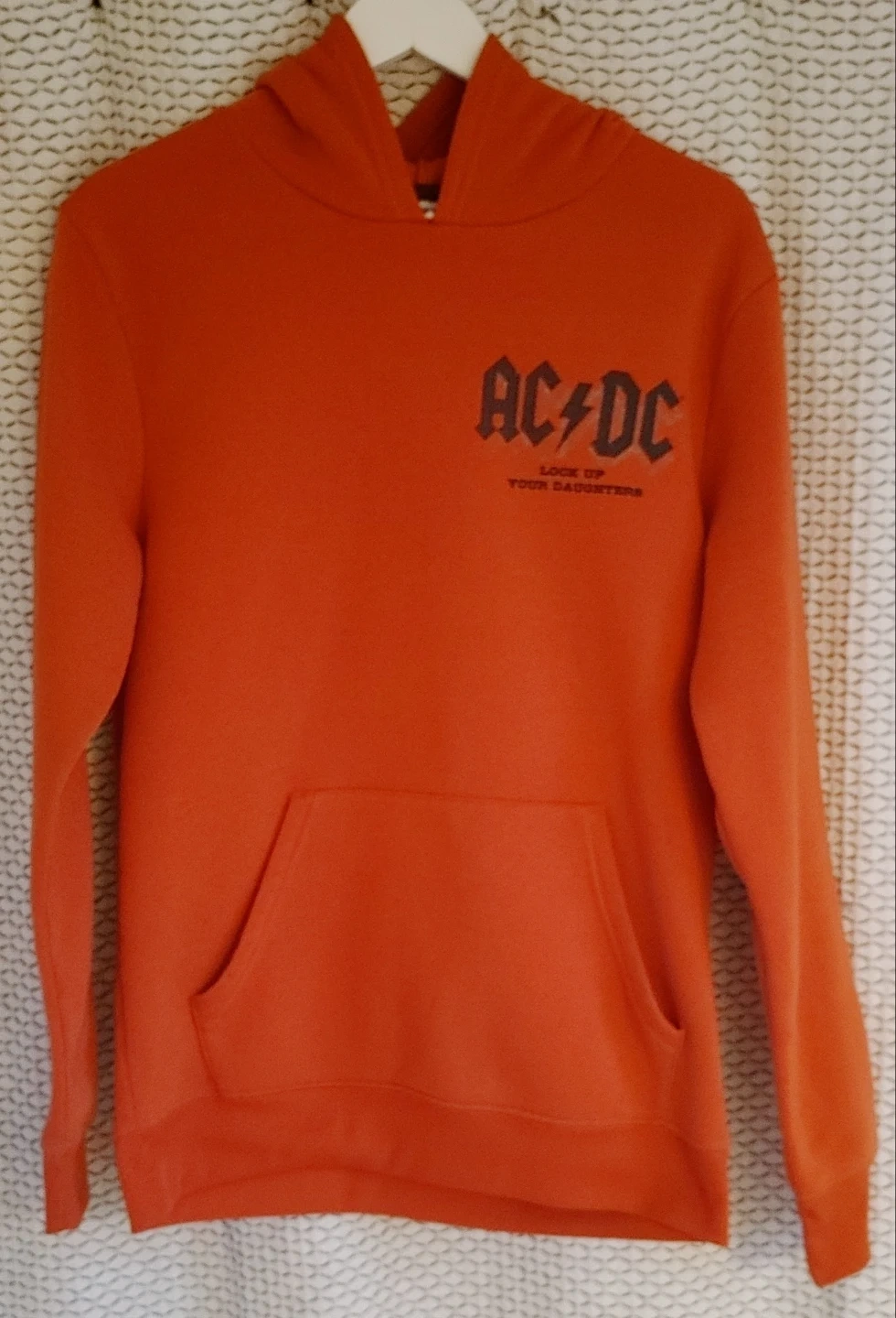 Mens size small AC/DC orange Hoodie. Good condition. No rips or fraying. Ribbed cuffs and hem with front hand kangaroo pouch. Smoke free home pick up Mt.Brydges cash only.