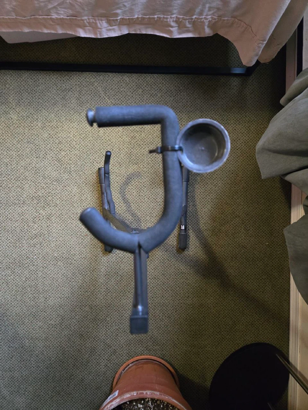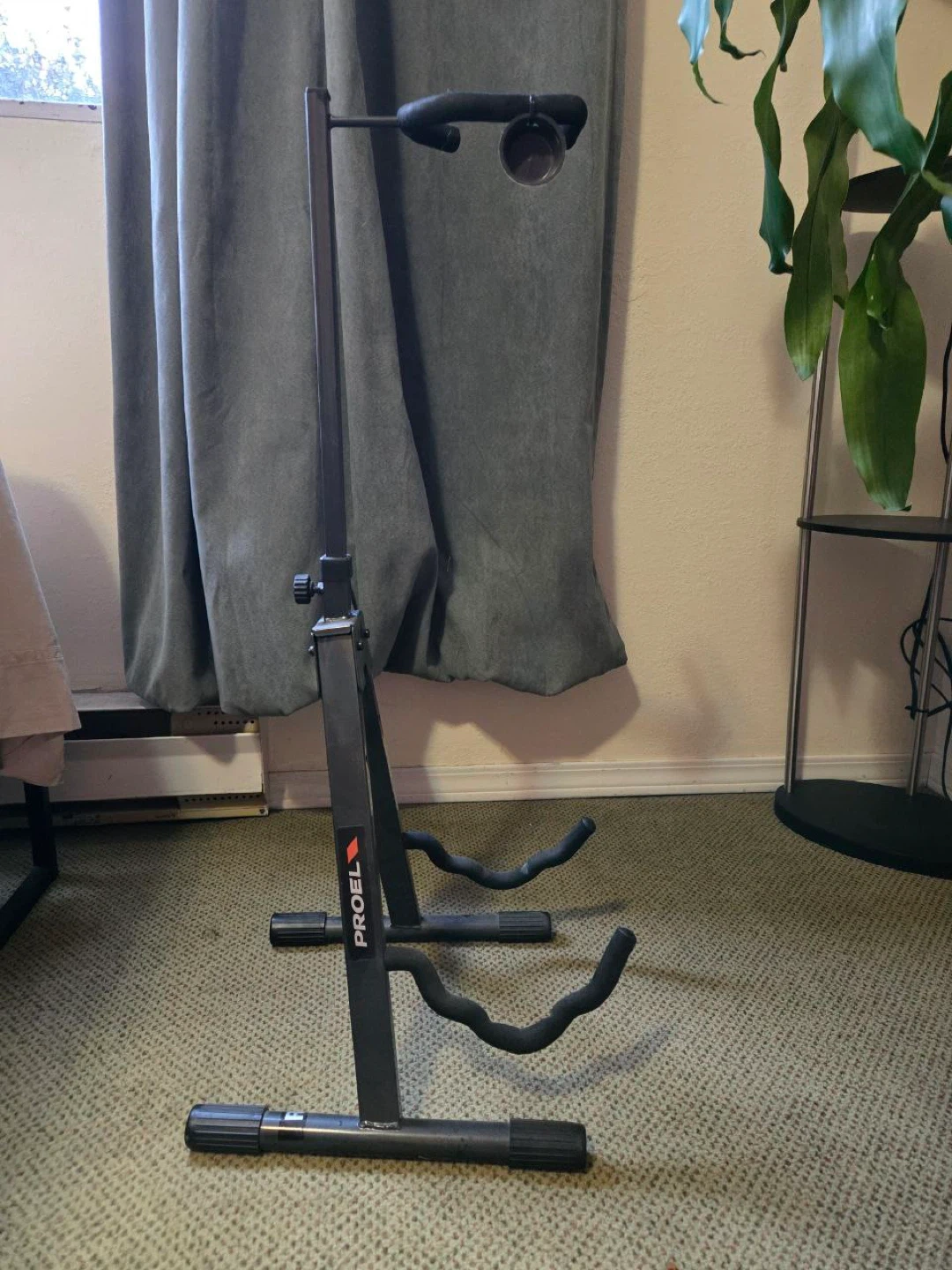 This is a PROEL guitar stand. It's made of metal and is grey in colour. It's collapsible for easy storage and transport. It's great for holding your guitar when not in use!