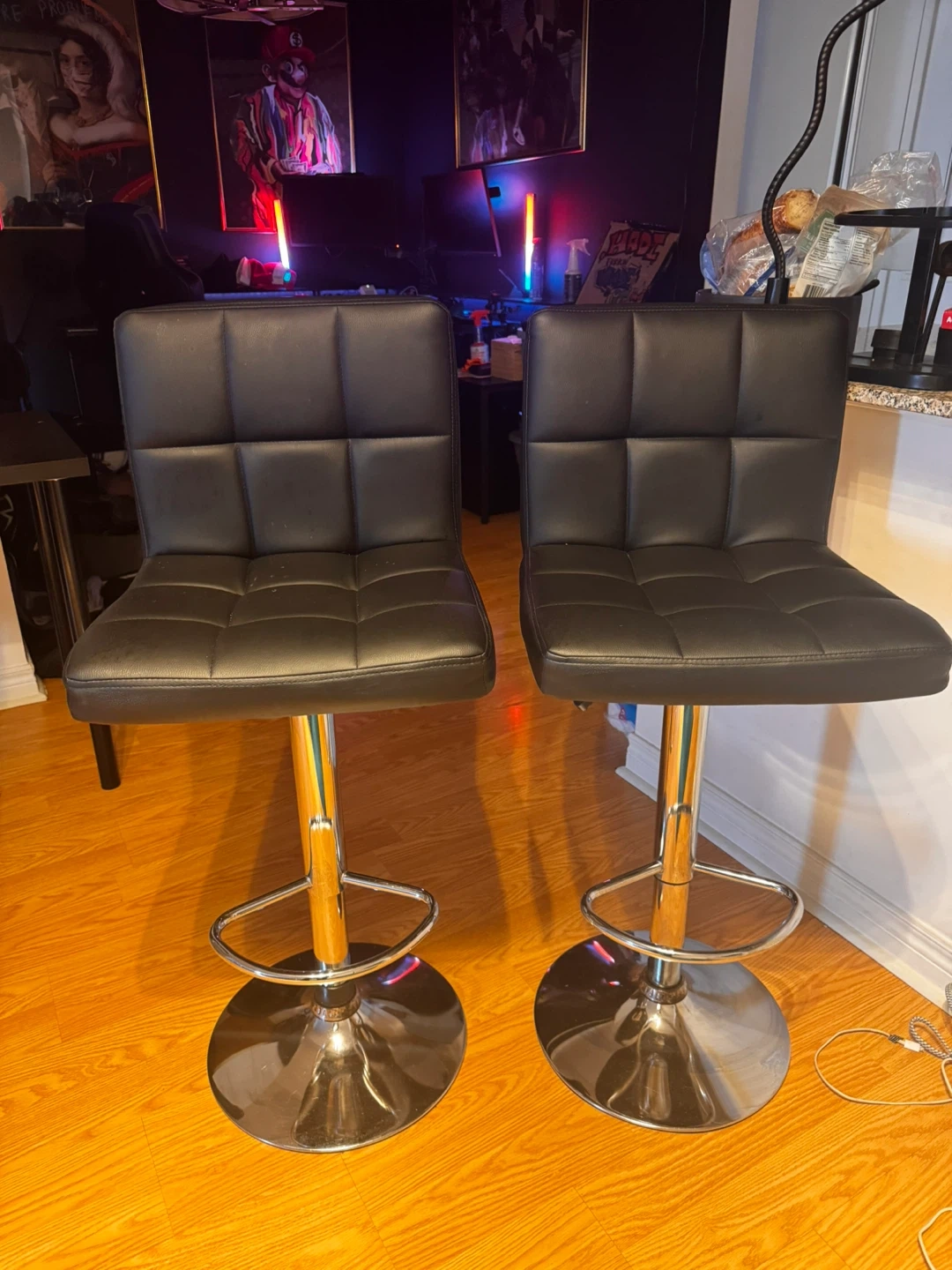 A set of two black adjustable bar stools. These stools are upholstered in what appears to be faux leather with a chrome base and adjustable height lever. They're perfect for a kitchen island or home bar setup. Each stool has a comfortable cushioned seat and a built-in footrest.
