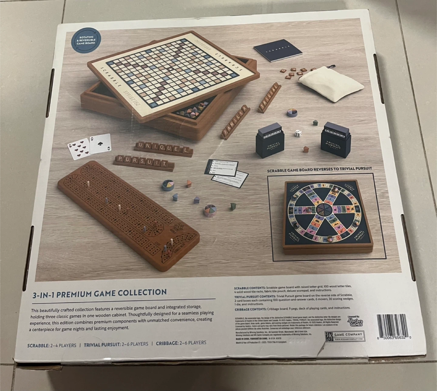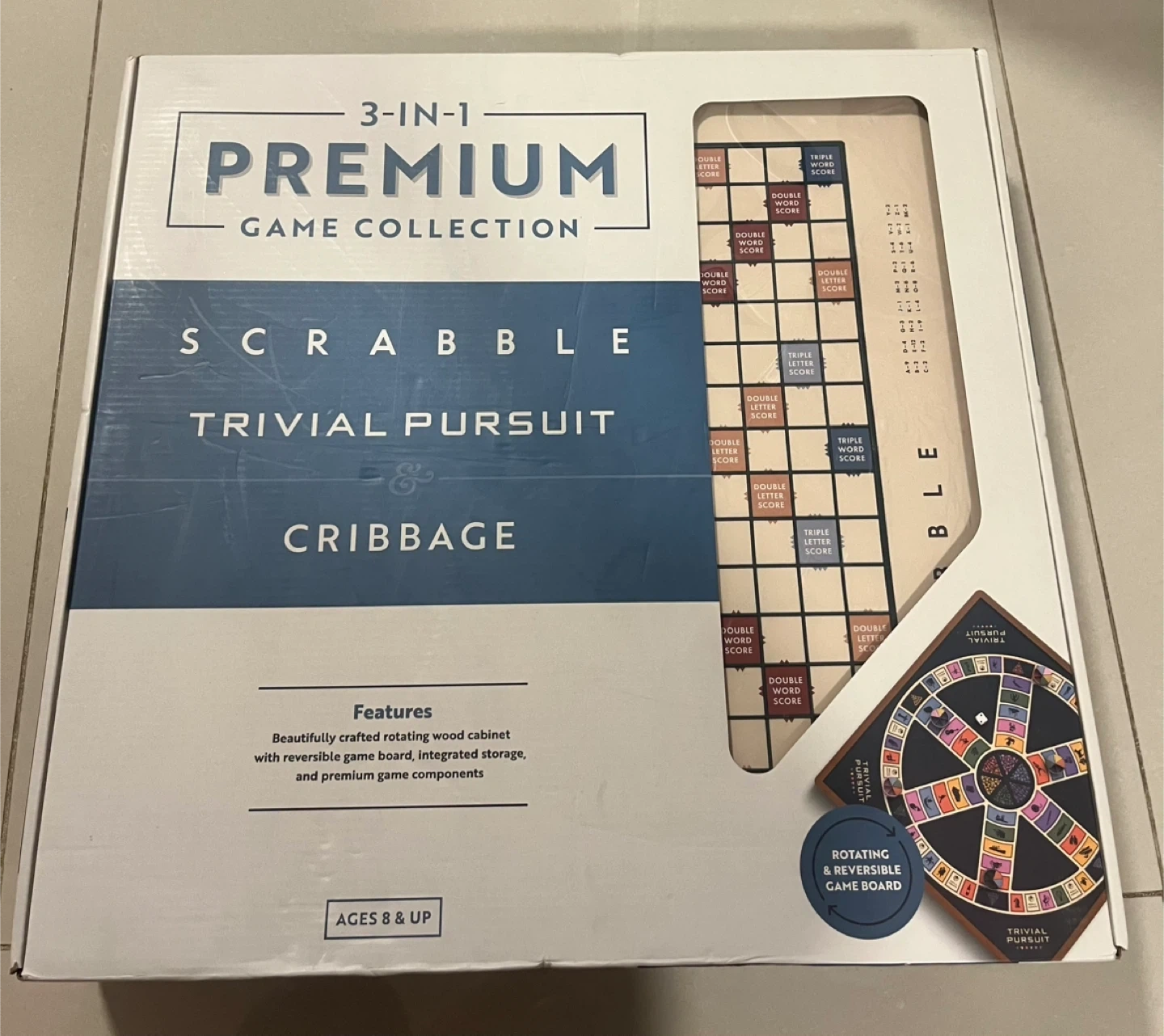 Brand new!Beautifully crafted wooden collection features a reversible game board with integrated storage. Includes Scrabble, Trivial Pursuit, and Cribbage components.Cash only
