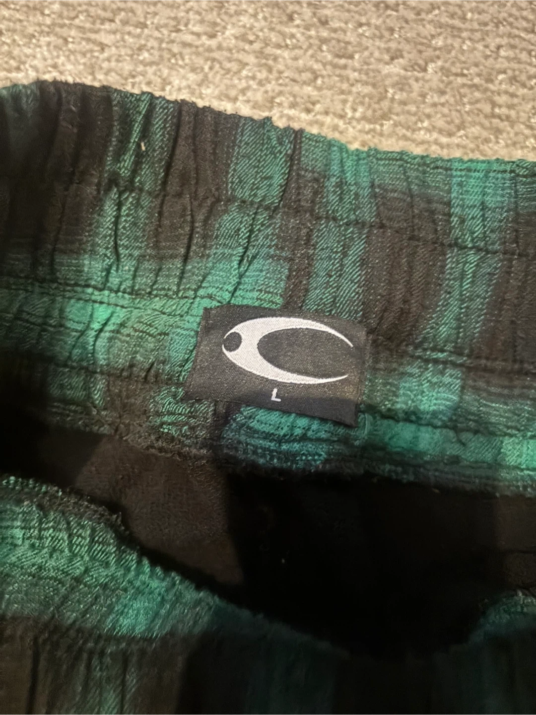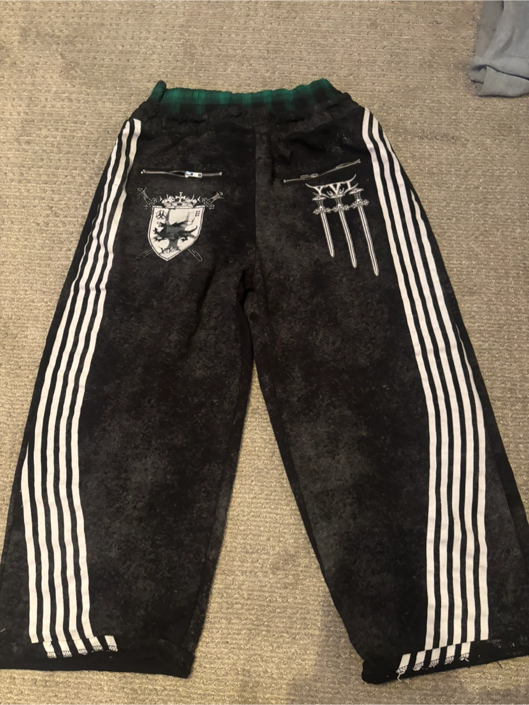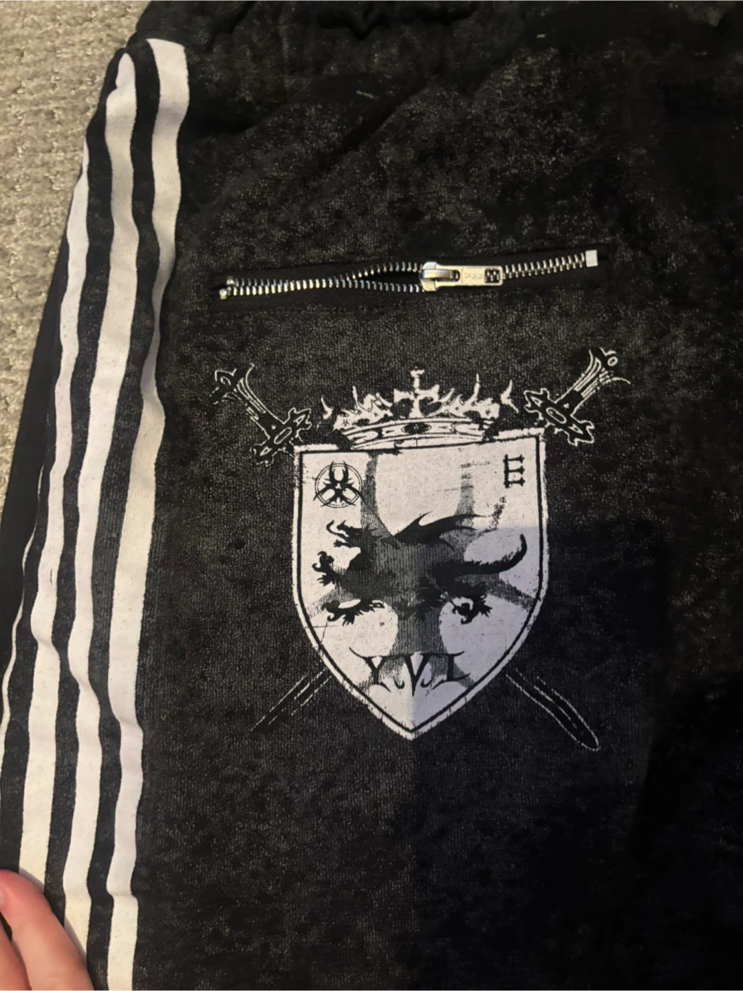 These pair of Cozy Worldwide Royal Knight Club Waxed Tracksuit pants joggers are a size L. They feature a unique graphic design on the back pockets and down the side stripes. The material is soft and comfortable, perfect for casual wear.