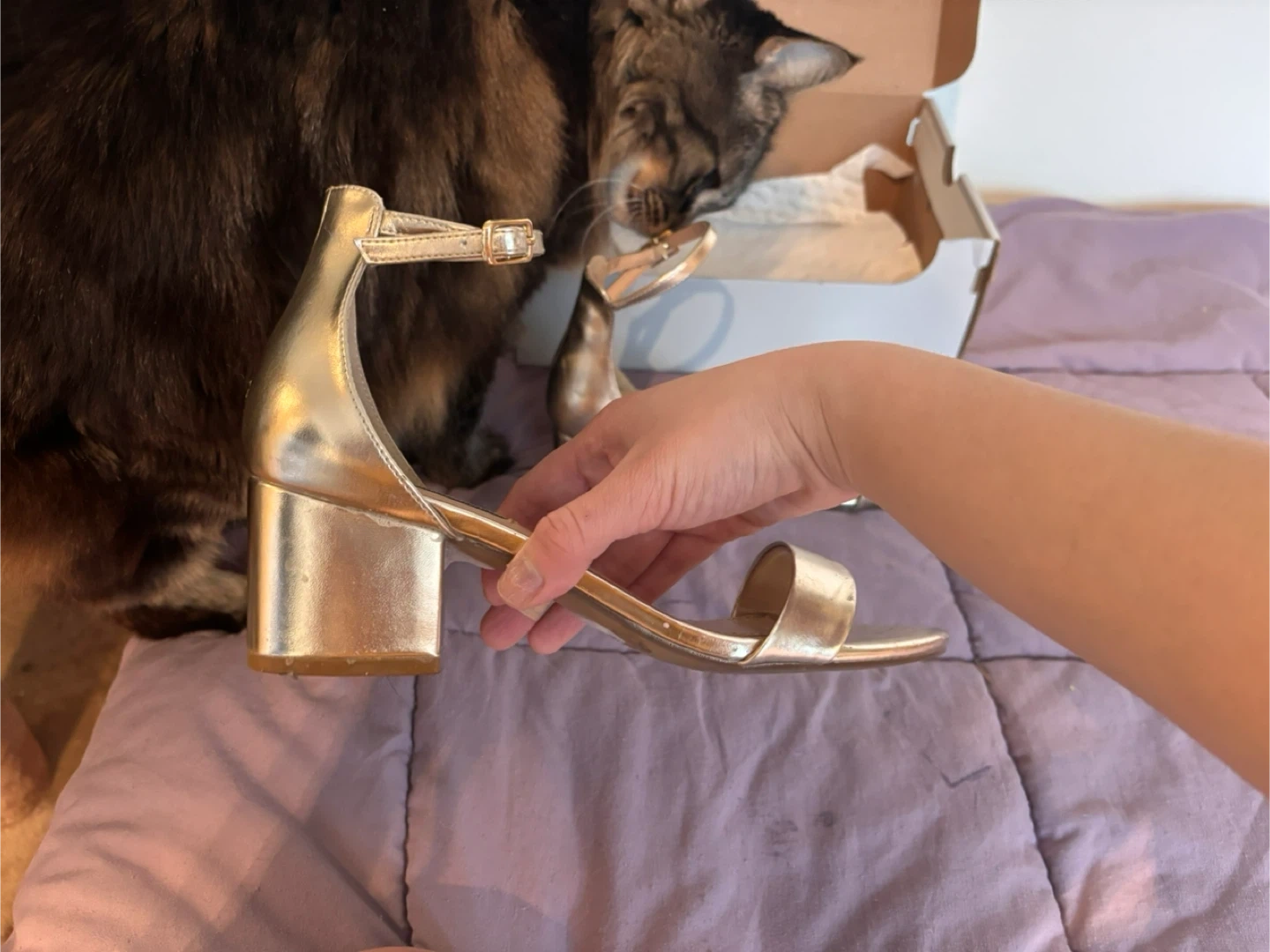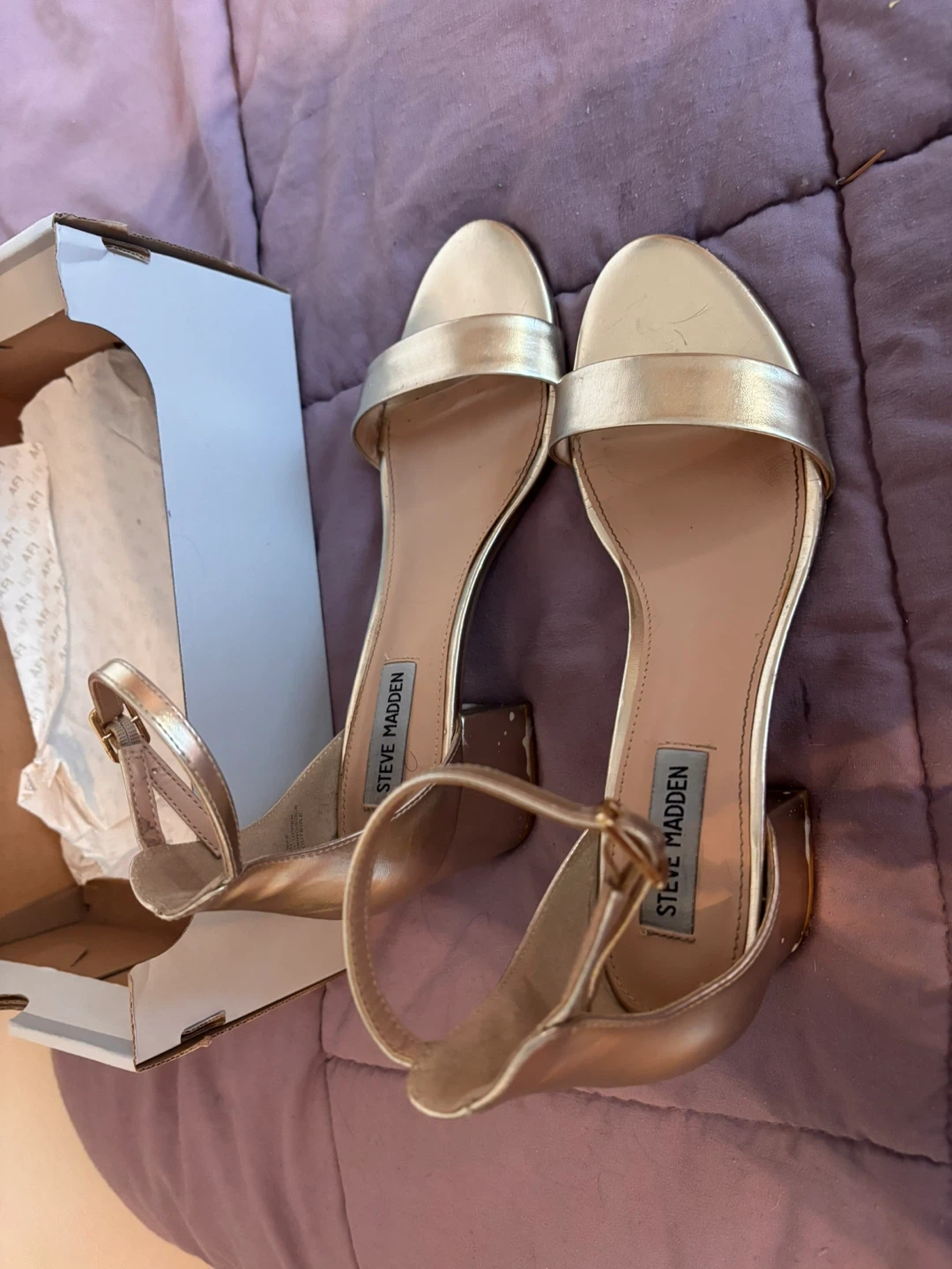 Selling my Steve Madden “Irenee” two-piece gold block-heel sandals. I bought these for prom and only wore them a few times — they’re super comfy and easy to walk in thanks to the chunky heel + ankle strap.