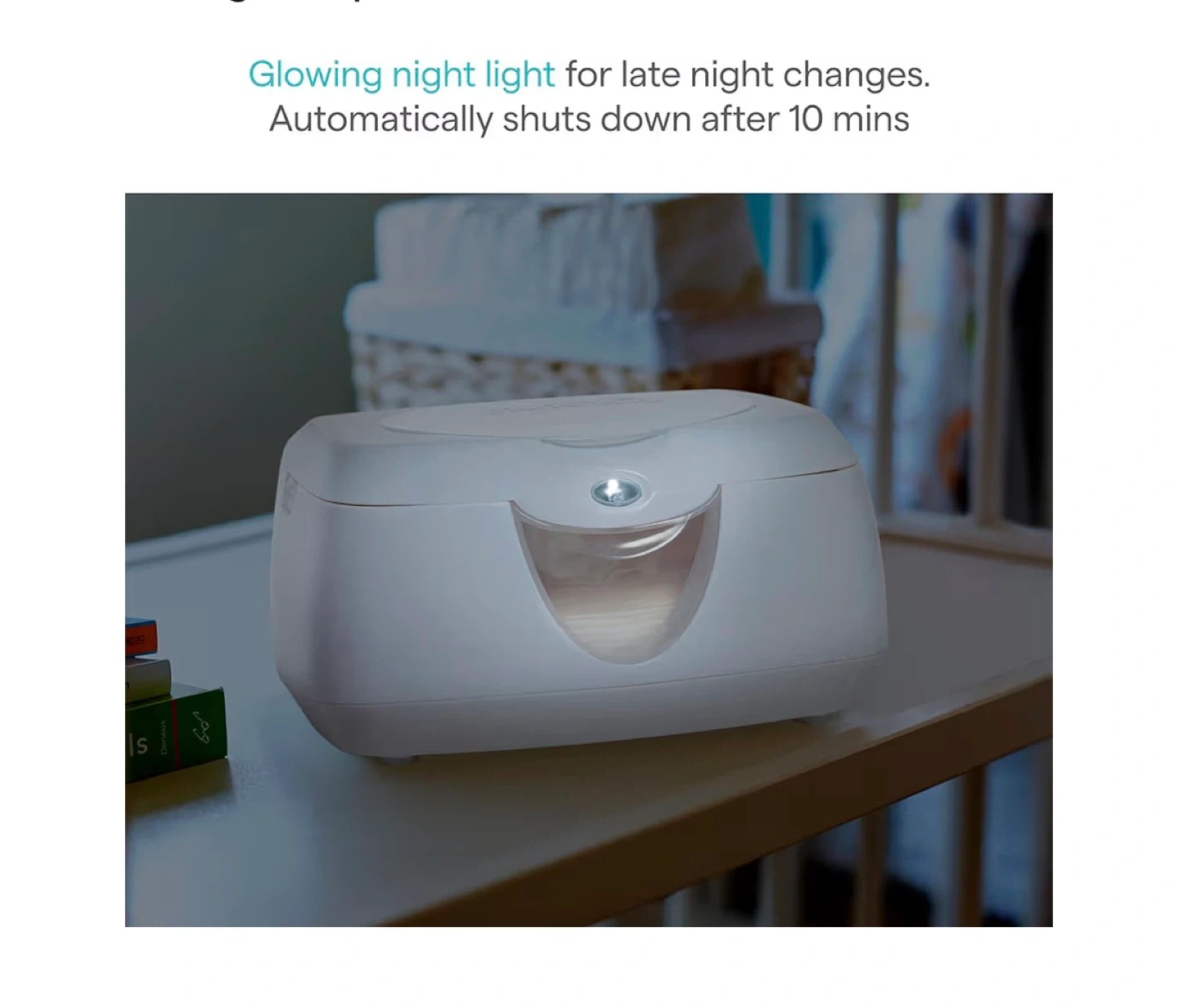 • Keeps baby wipes warm and moist (no more cold wipes!)