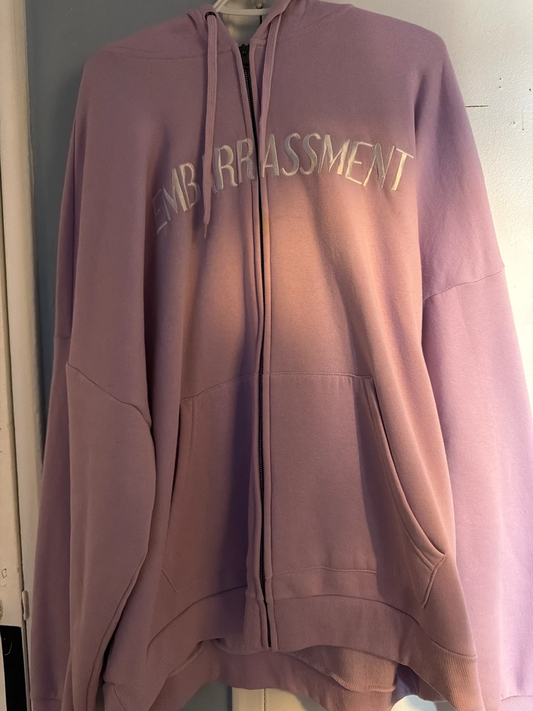 This zip-up hoodie is a fun lavender colour. It has "EMBARRASSMENT" embroidered on the front and a cute walrus graphic on the back. It's made of a soft material. This is a great piece for casual wear!