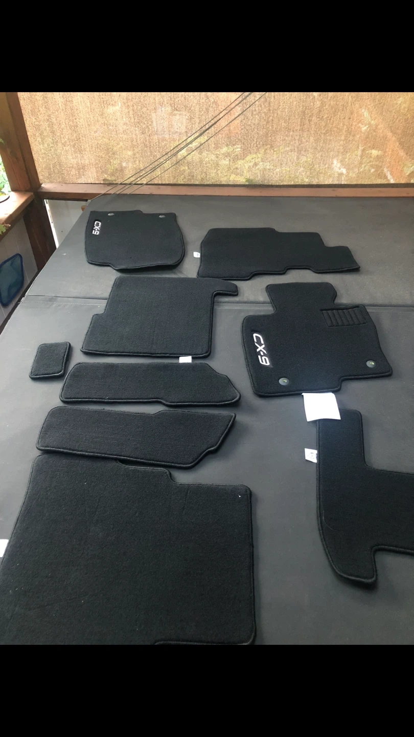 Set of black carpet floor mats for a CX9. Includes front, rear, and middle row pieces. Protects your car's interior from dirt and wear.