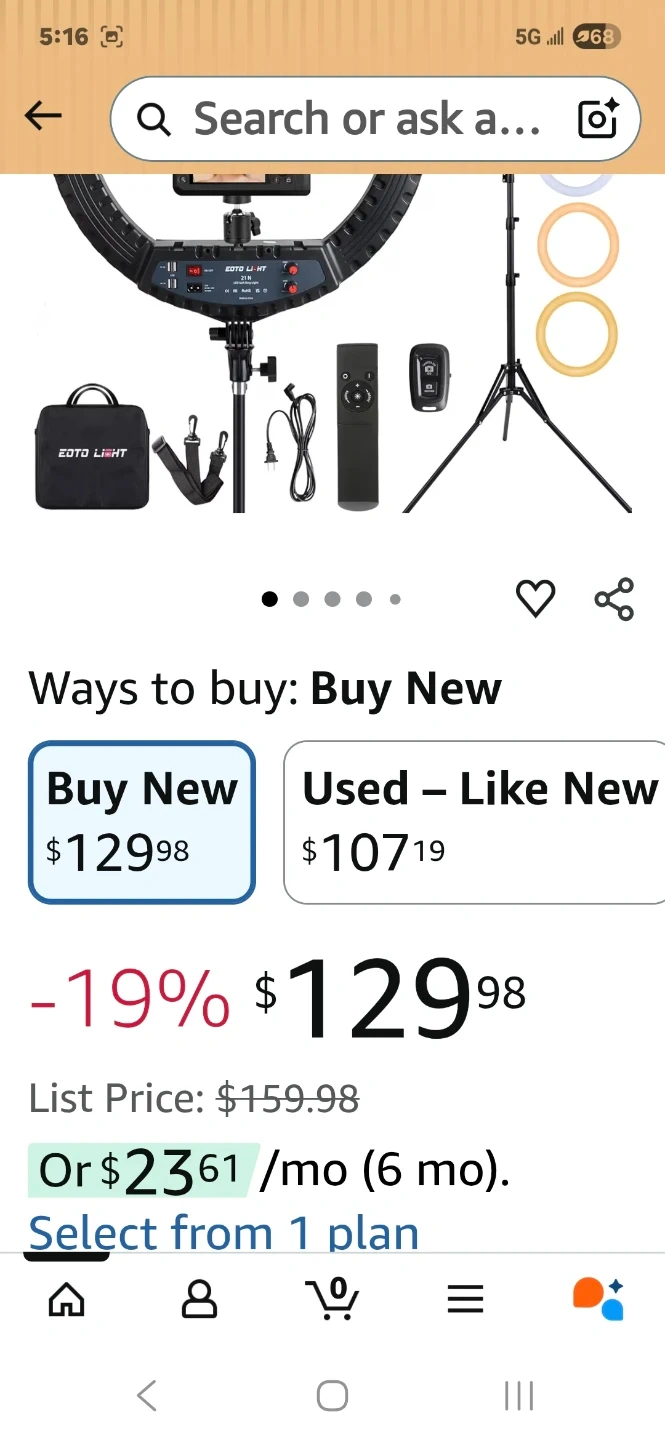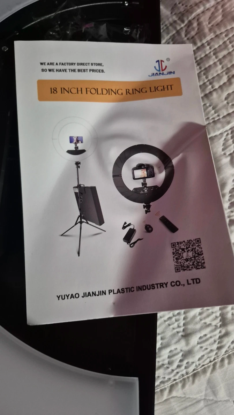 This Jianjin folding ring light comes with a tripod stand and remote control. It includes a carrying bag and is designed for photography and video. The light is 18 inches in diameter. It's great for selfies, vlogging, and video conferencing.