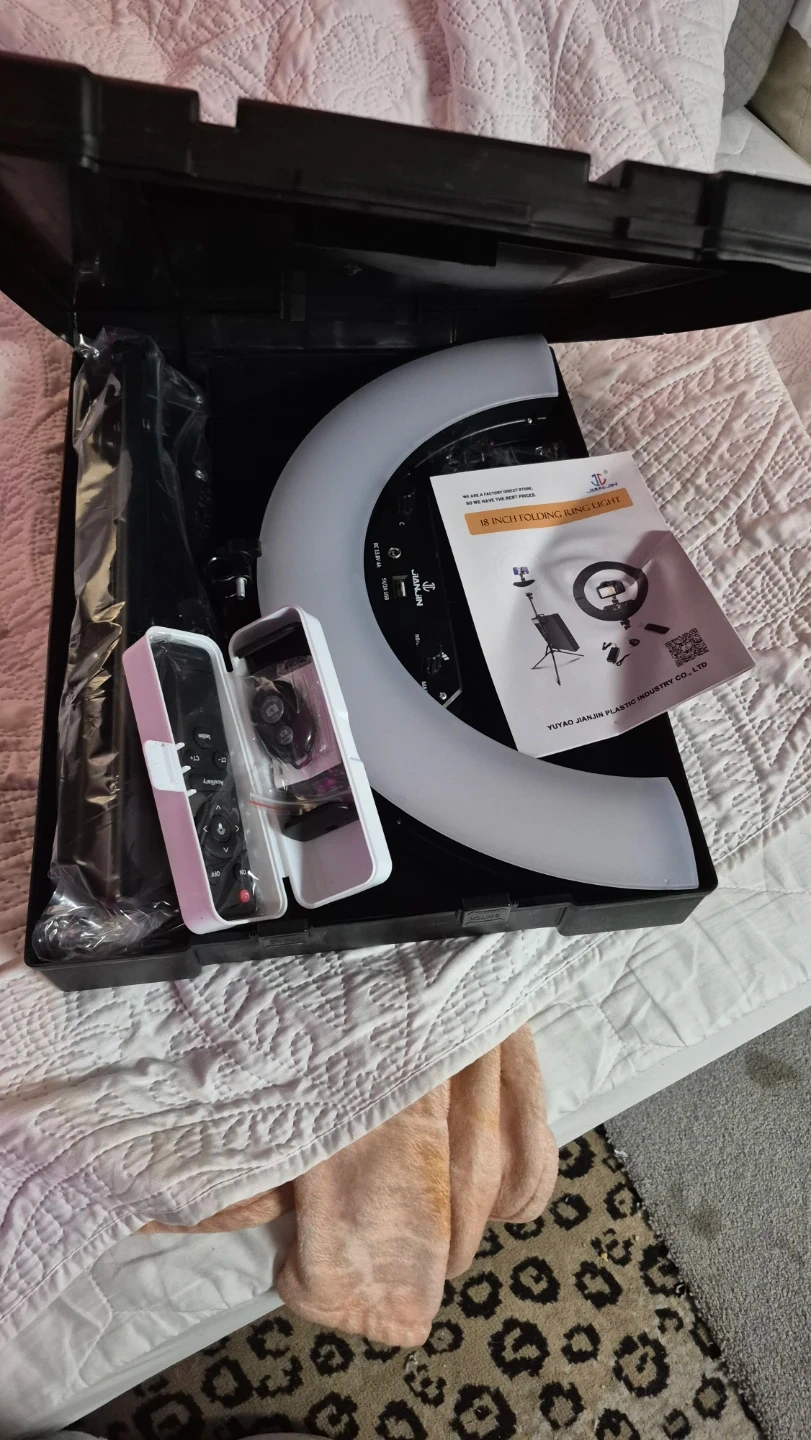 This Jianjin folding ring light comes with a tripod stand and remote control. It includes a carrying bag and is designed for photography and video. The light is 18 inches in diameter. It's great for selfies, vlogging, and video conferencing.