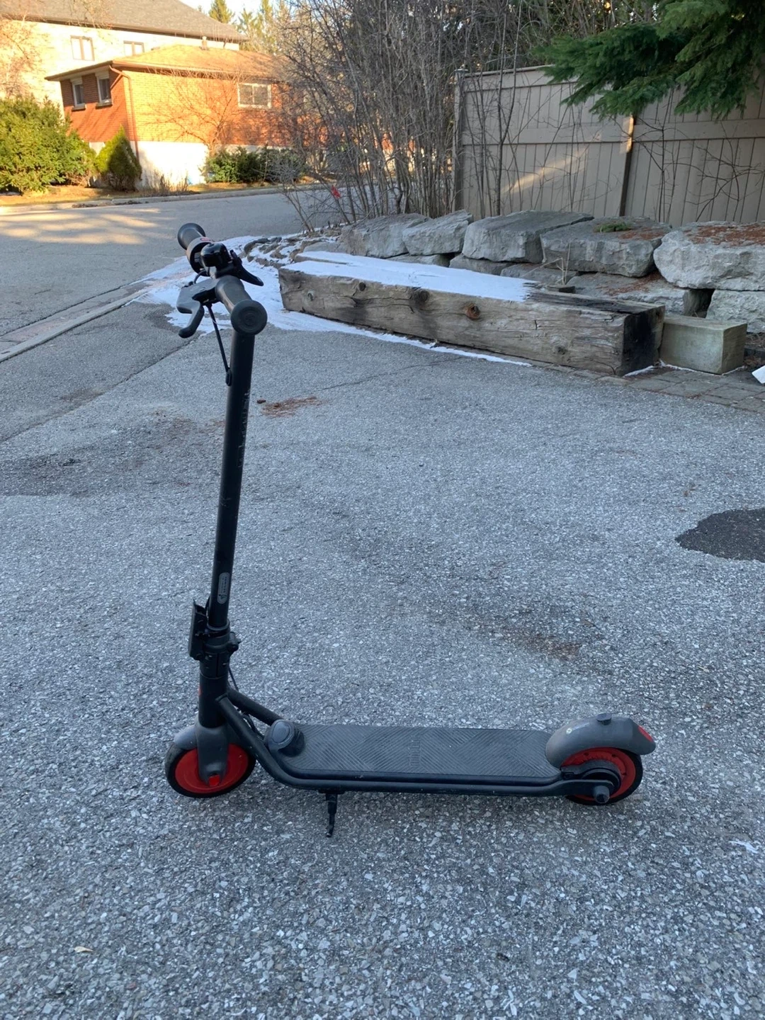 This Segway Ninebot electric kickscooter is black with red wheel accents. It's a great way to get around town. Foldable for easy storage and transport! Charger included.