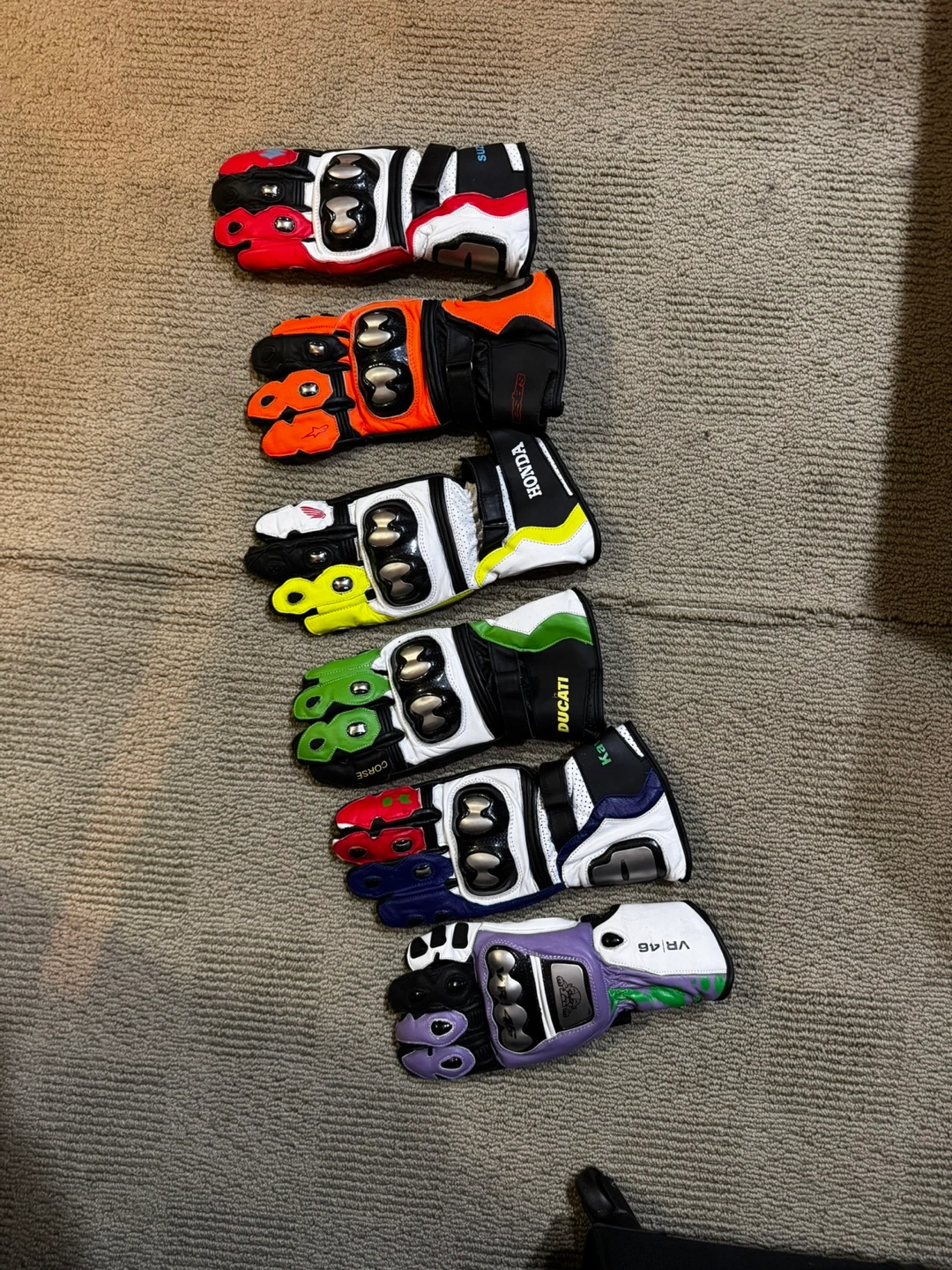 Selling a collection of motorcycle racing gloves. Brands include Kawasaki, Honda, Ducati, Suzuki, and VR46. Great for motorcycle enthusiasts! Brand new M/L/XL Pure leather