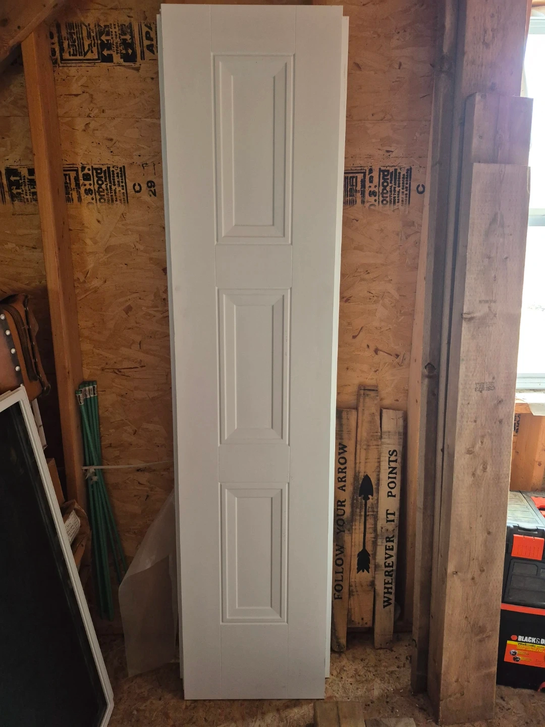 This is a white interior door with a three-panel design. It's constructed from durable materials. This door is suitable for any room in your home. (2 closet doors)