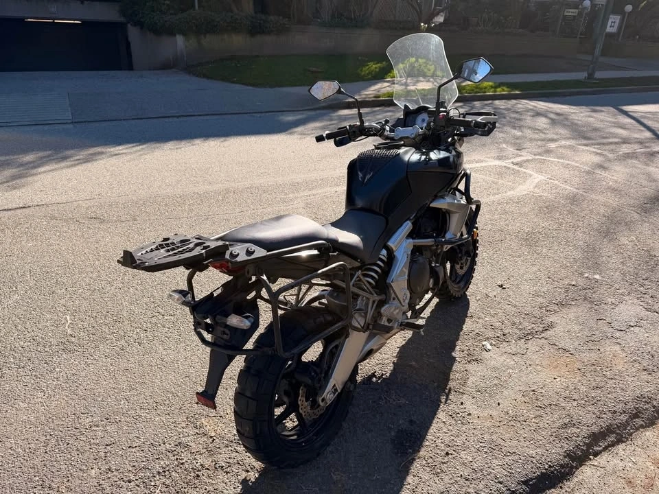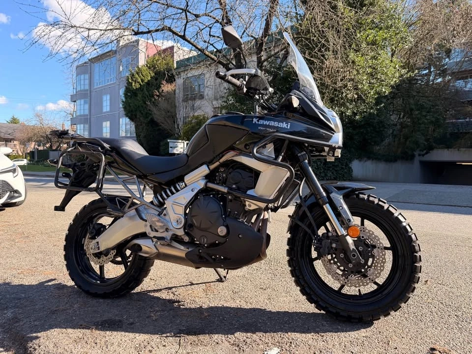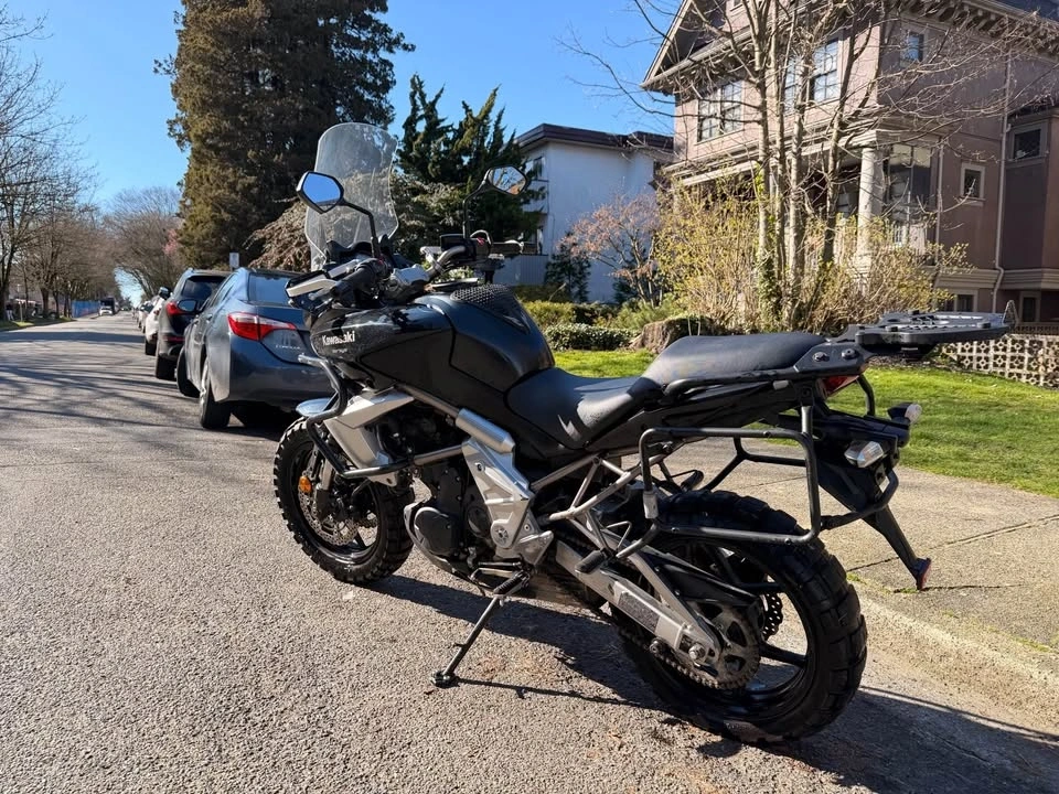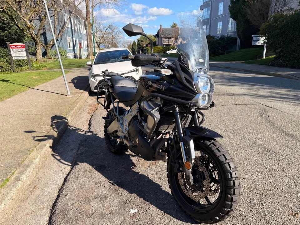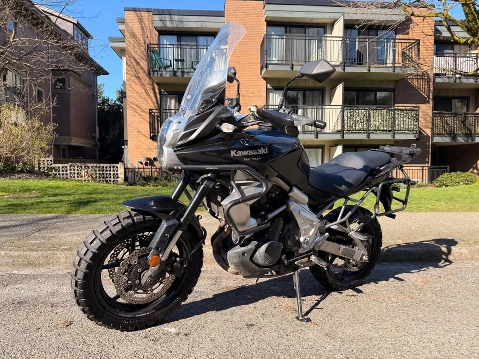 2010 Kawasaki Versys 650, 25,000 km. Reliable adventure/touring bike, runs great. Comfortable on highway and off-roading. Within the last 5,000 km: tires, fork seals, brakes, chain and sprocket replaced by previous owner. Clutch cable replaced by me. Extras installed: Oxford heated grips (needs a small wiring fix), luggage racks, rear box mounting plate (GIVI, I think), locking tank bag (well used but still great), crash bars, and Barkbusters hand guards. Bike is ready to ride. Low mileage for the year. Stored inside and on battery tender. Not currently plated but can be for serious buyers. Test ride with cash and license. Located in Kitsilano.