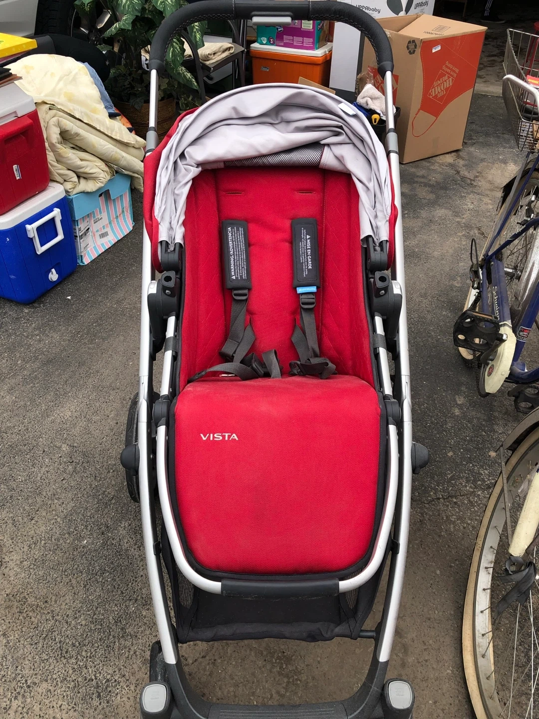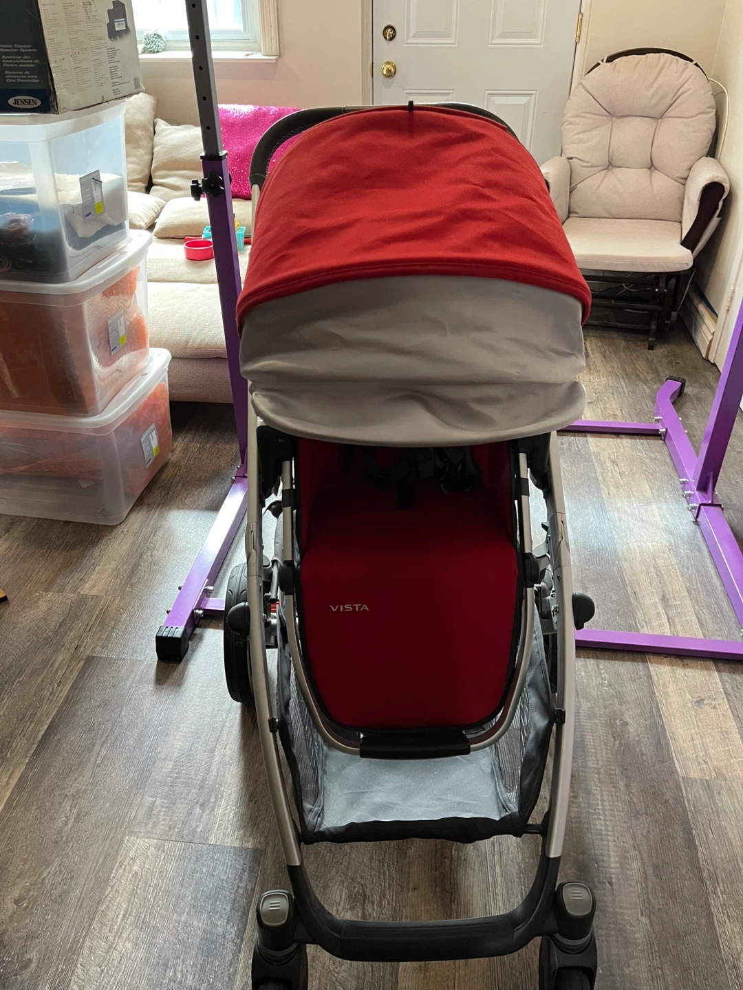 This is a red UPPAbaby Vista stroller. It's designed for smooth rides and everyday use. Includes a child harness with 5-point safety restraints. Only used twice and went to storage. The bassinet is brand new still in the box.