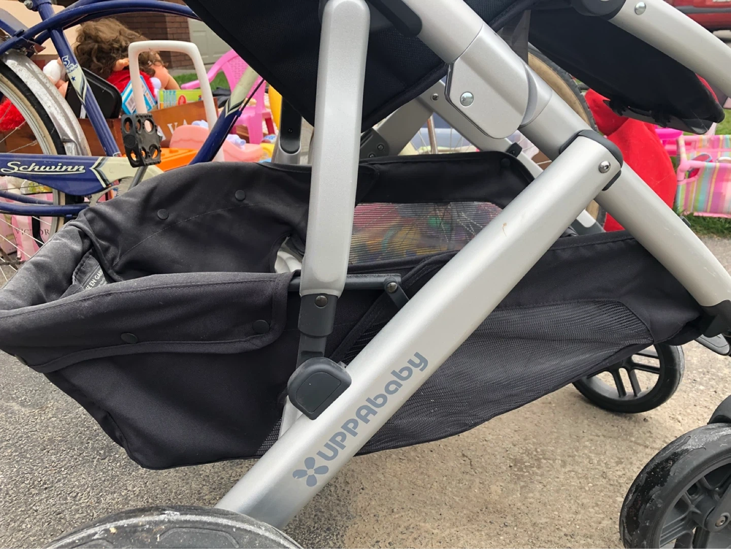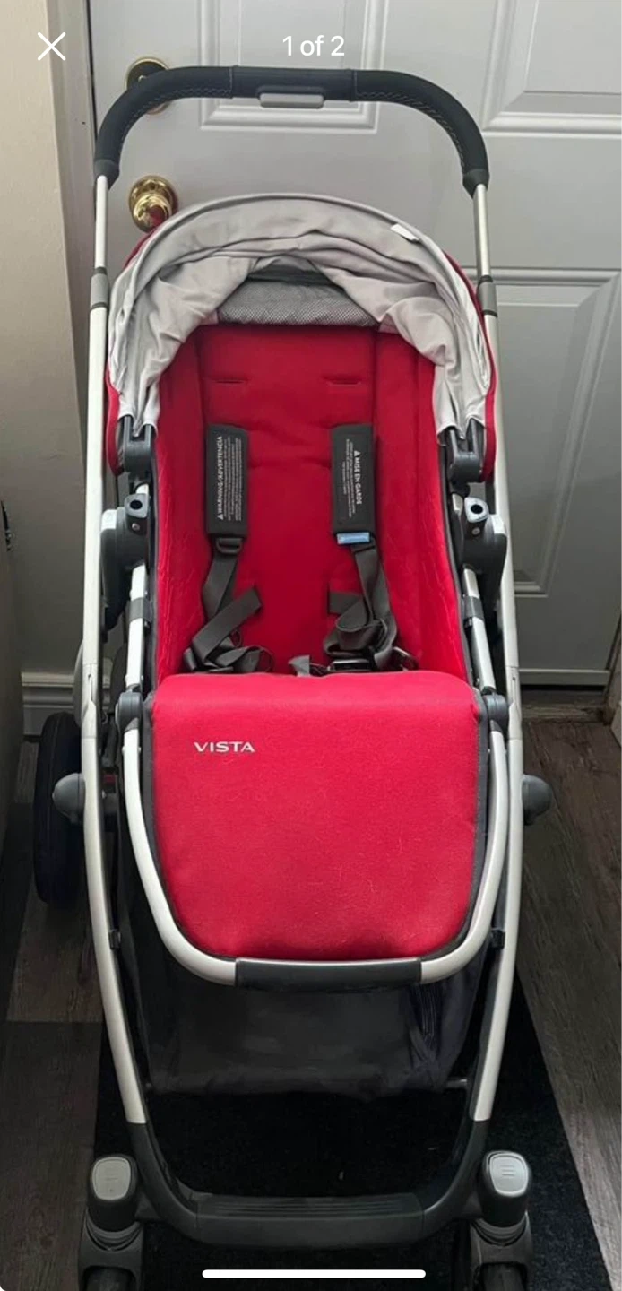 This is a red UPPAbaby Vista stroller. It's designed for smooth rides and everyday use. Includes a child harness with 5-point safety restraints. Only used twice and went to storage. The bassinet is brand new still in the box.