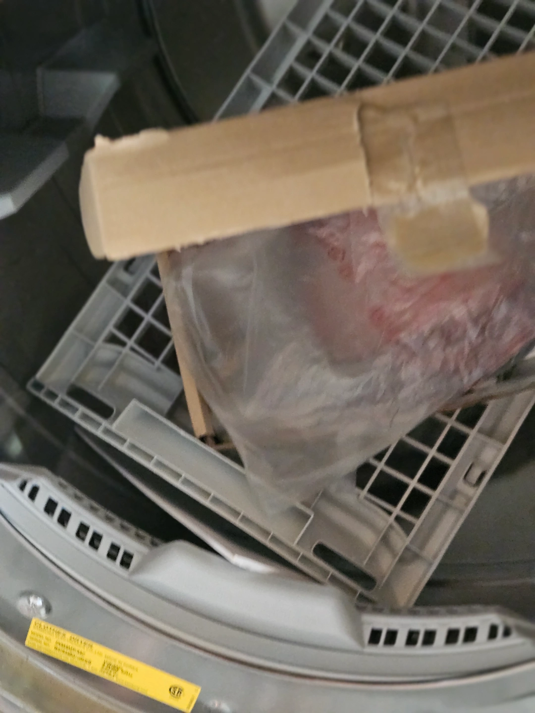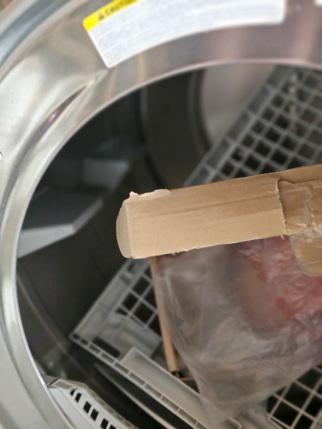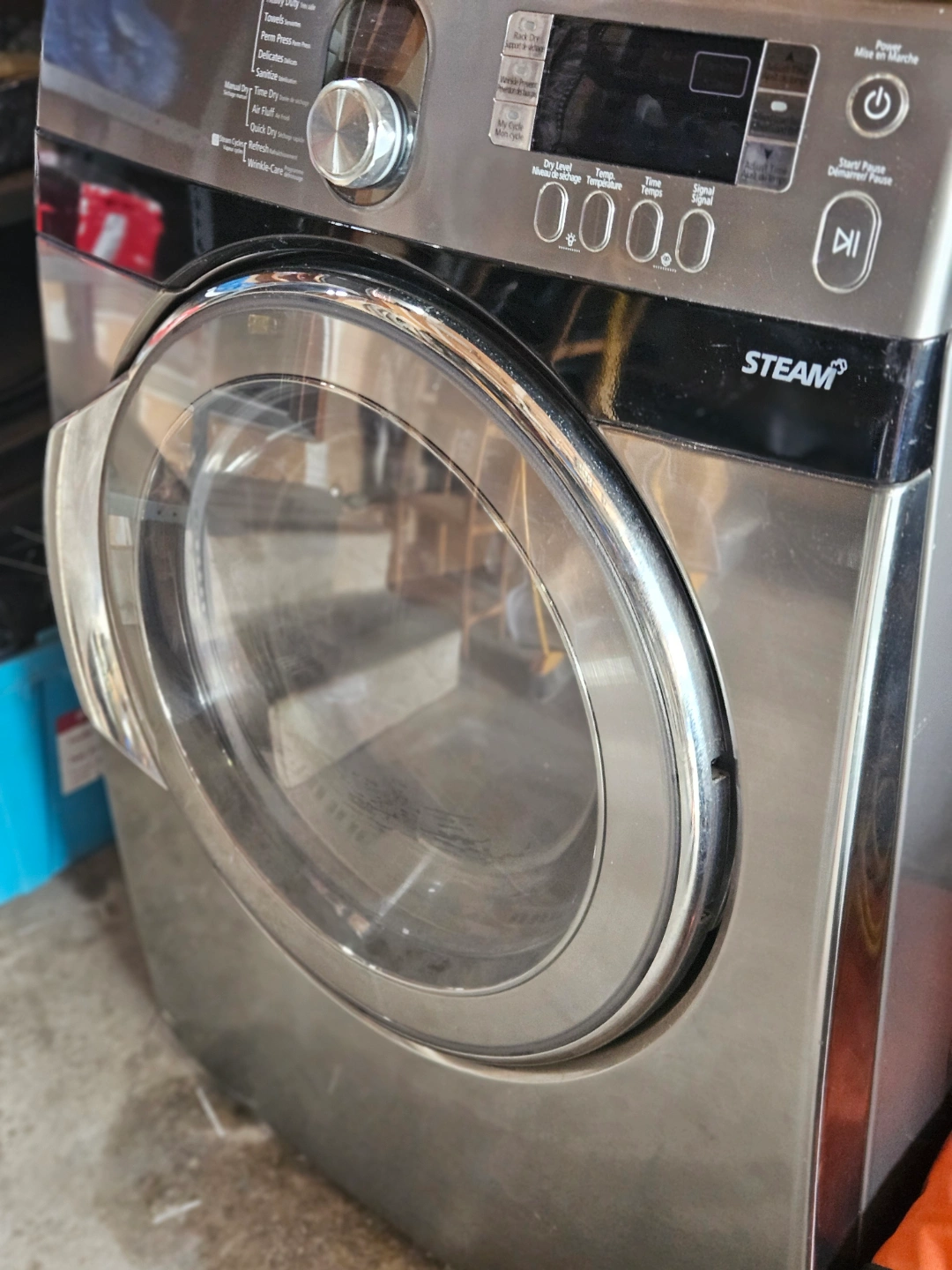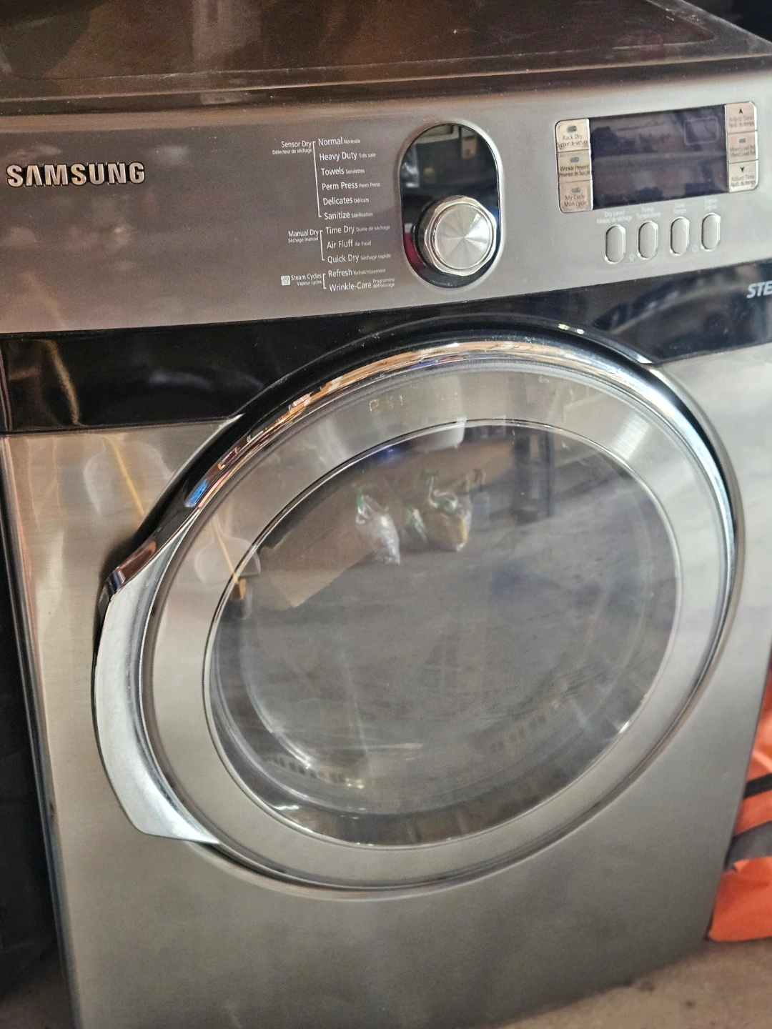 Samsung electric dryer. Features a steam function and various drying cycles. Stainless steel finish. Includes a lint filter. Model number not visible.