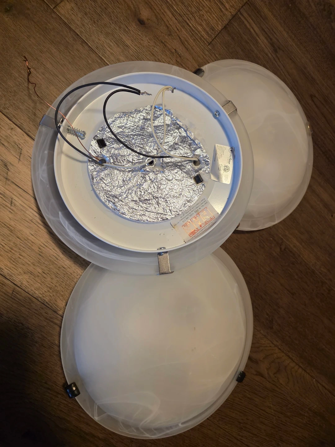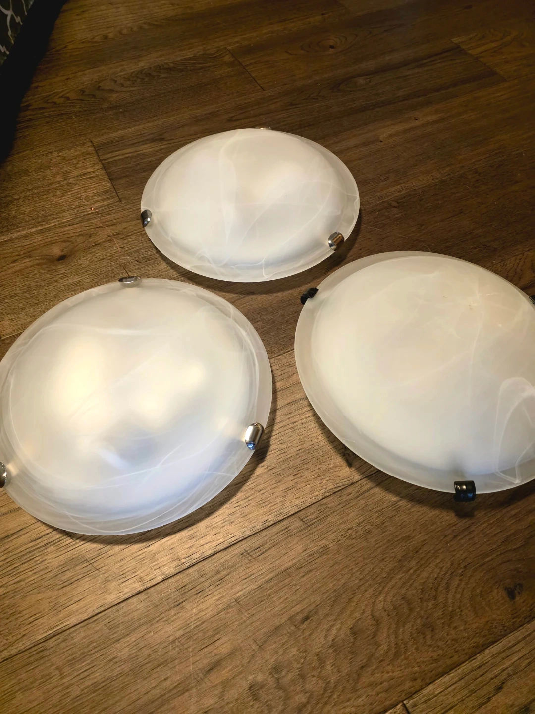 Includes three flush mount ceiling light fixtures with frosted glass shades and a swirl design. Each light has a white base and brushed nickel hardware. These fixtures are designed for easy installation and provide ambient lighting. All in great condition, no chips or scratches. Willing to sell individually for $15.