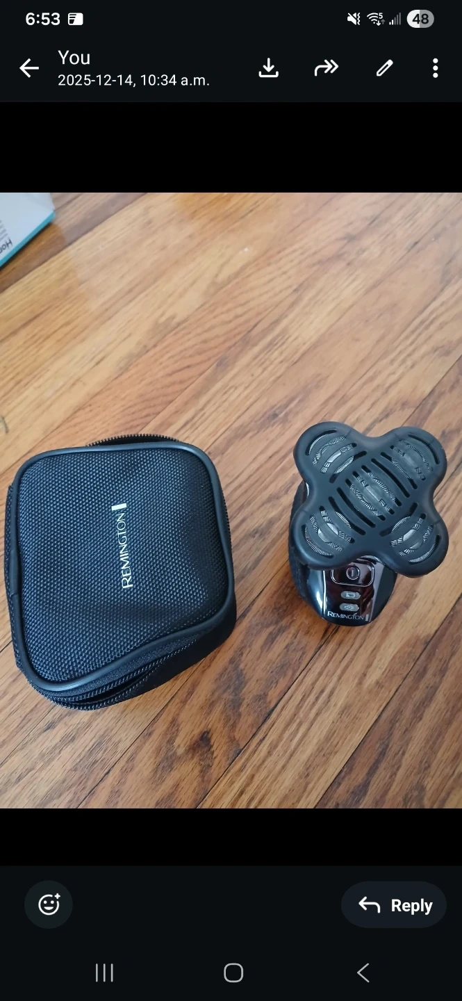 A Remington electric shaver, complete with its protective travel case. It's a rotary shaver with a black finish and includes a charging port. Ideal for maintaining your look on the go!